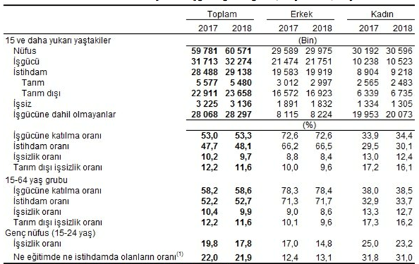 İşgücü söz konusu dönemde 32 milyon 274 bin kişi, işgücüne katılma oranı ise yüzde 53,3 olarak gerçekleşti. İşgücüne katılma oranı erkeklerde yüzde 72,6; kadınlarda ise yüzde 34,4 oldu.