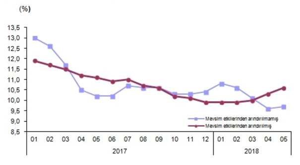 Grafik: Mevsim etkilerinden arındırılmış işsizlik oranı, MAYIS 2018