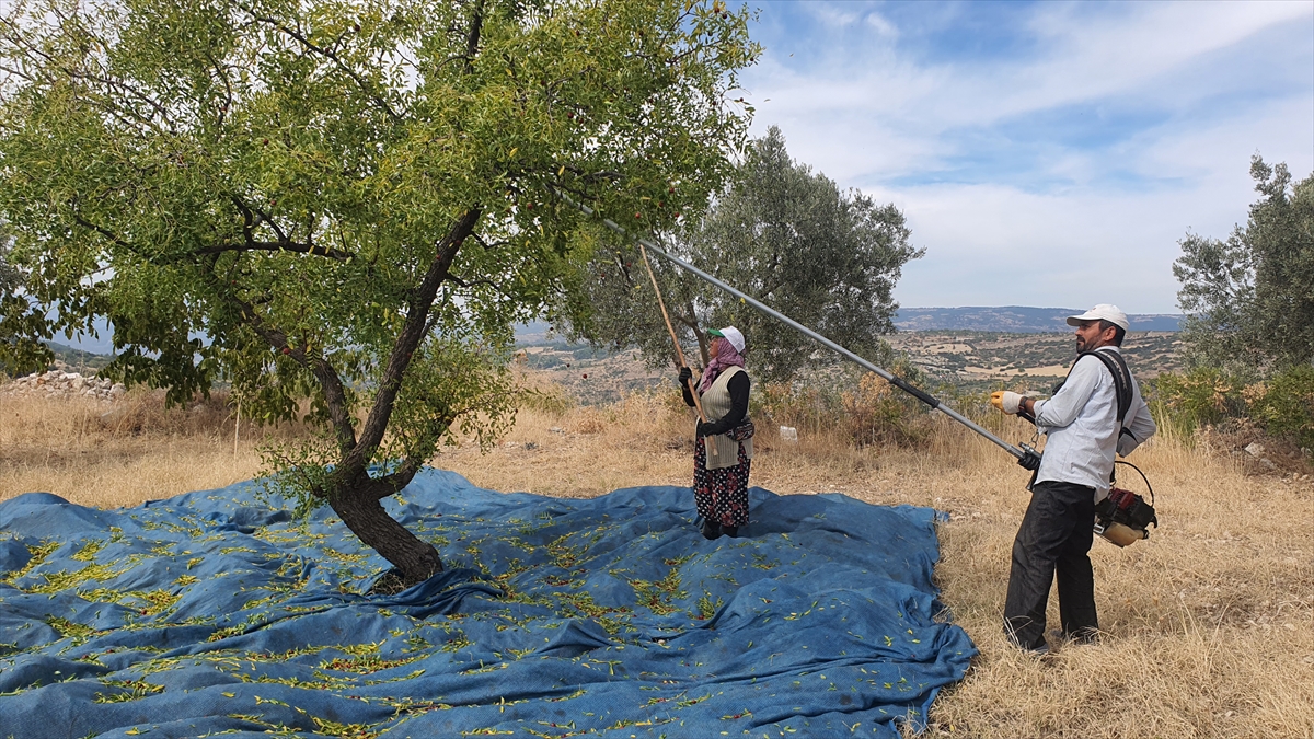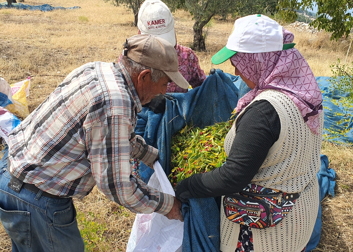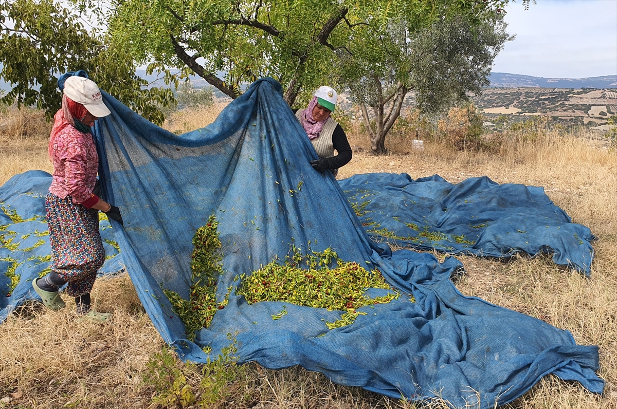 Hasat için sabah erken saatlerde işbaşı yapan üreticiler, ağaçlardaki meyveleri makine ve sırık yardımıyla ağaç diplerine serdikleri örtünün üzerine silkeliyor.