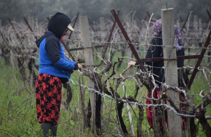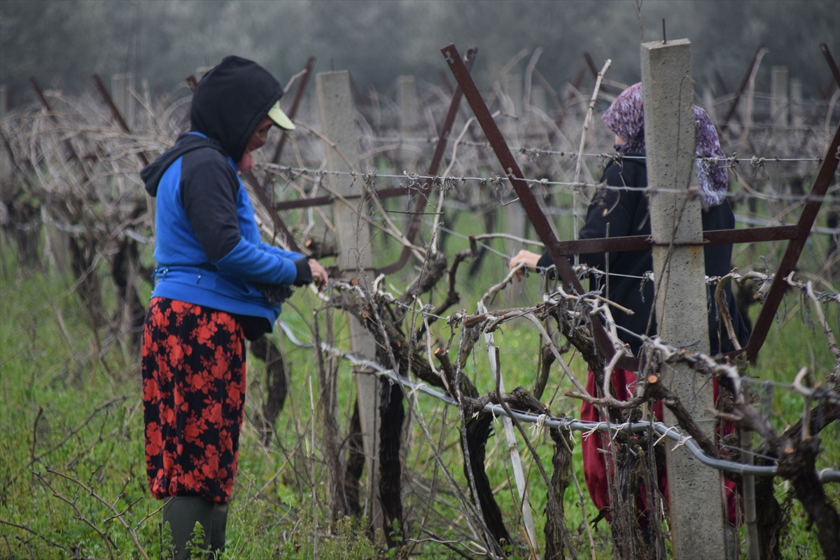 Bağlarda erkek işçiler budama yaparken, kadınlar ise kesilen dalları askı olarak adlandırılan tellere iple bağlıyor.