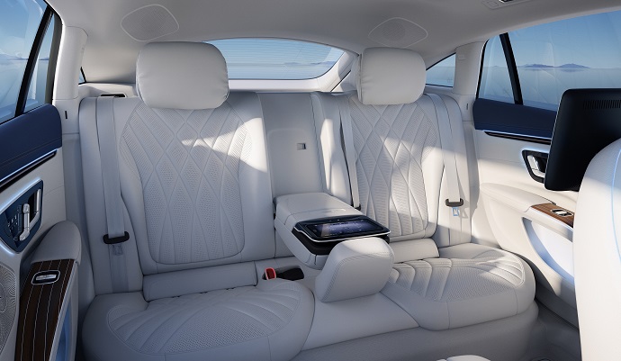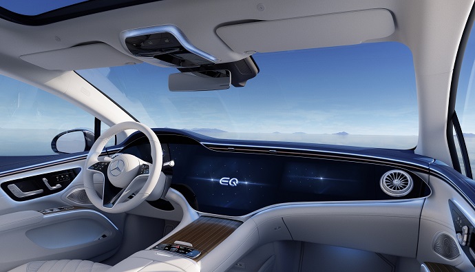 MBUX Hyperscreen, iç mekân tasarımının en can alıcı noktalarından biri olarak öne çıkıyor. Büyük ve kavisli ekran, sol A sütunundan sağ A sütununa kadar konsol boyunca uzanıyor. Kavisli camın ardında üç adet ekran bulunuyor ve bunlar bir araya gelerek tek bir ekran gibi görünüyor. Ön yolcuya ait 12,3 inçlik OLED ekran, kişiselleştirme ve kontrol alanı sağlıyor. Yasal düzenlemelere bağlı olarak sürüş esnasında eğlence işlevlerine sadece bu ekrandan erişim sağlanabiliyor. Akıllı kamera tabanlı bir güvenlik sistemi, sürücünün ön yolcu ekranına baktığını algılaması halinde otomatik olarak ekranı karartıyor.