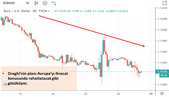 TCMB faiz kararının açıklandığı gün Avrupa Merkez Bankası (AMB) da faiz kararını açıkladı. AMB Başkanı Mario Draghi görevden ayrılacağı tarih olan Ekim 2019’dan önceki son para politikaları toplantısında faizleri 10 baz puan geriye çekme ve aynı zamanda parasal gevşeme politikalarına hız verme sinyalleri verdiği 25 Temmuz’daki toplası ile Euro’nun özellikle dolara karşı güç kaybetmesine neden oldu.