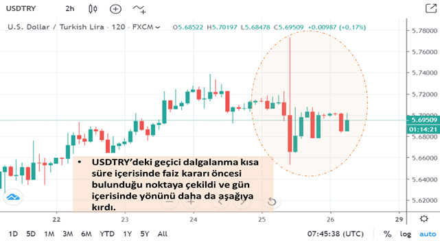 Faiz kararının hemen ardından 5.77’lere dayanan USDTRY şu sıralar ~%1.7 düşüş ile 5.67 seviyelerinde seyrediyor.