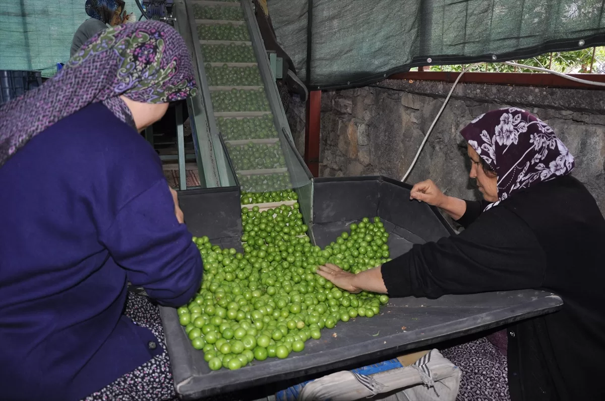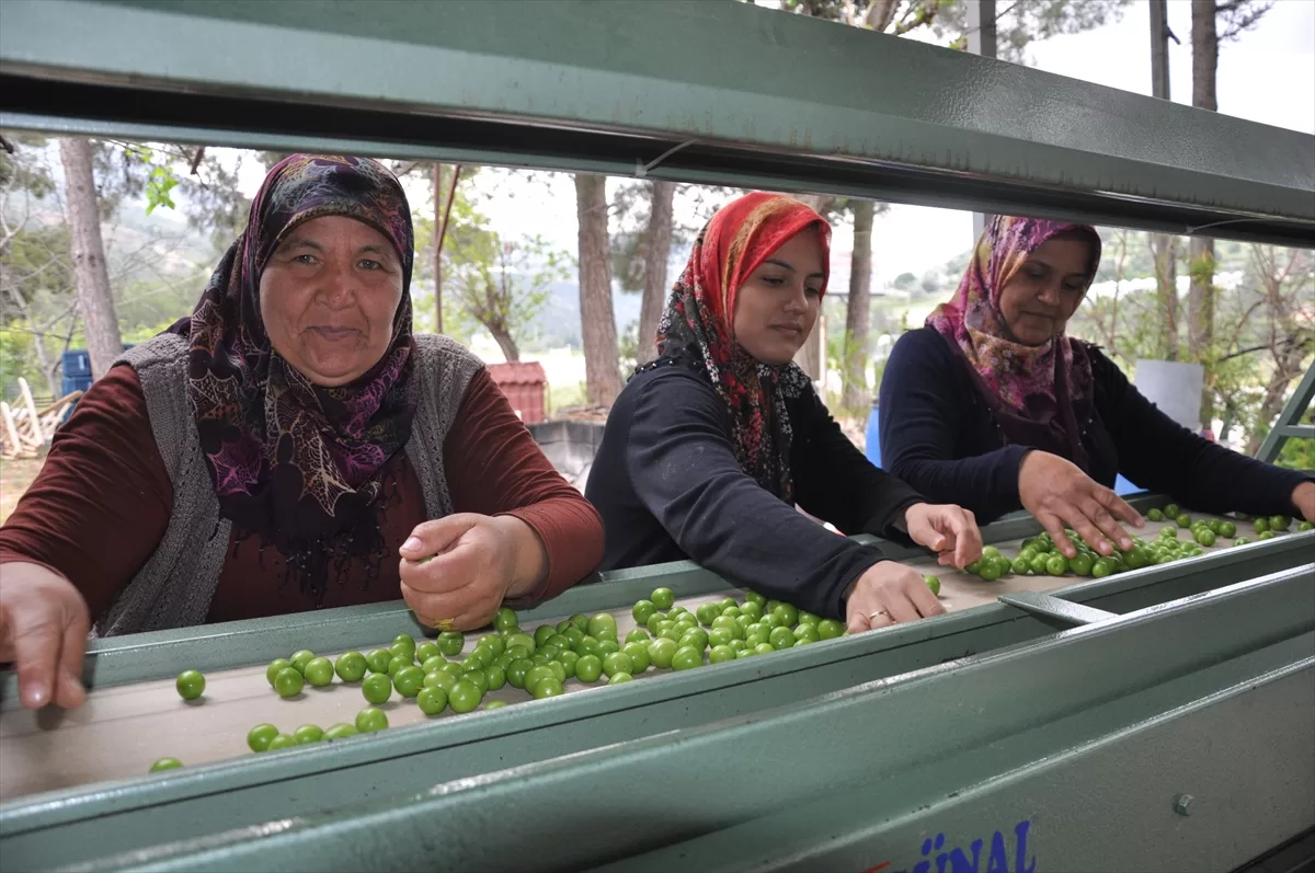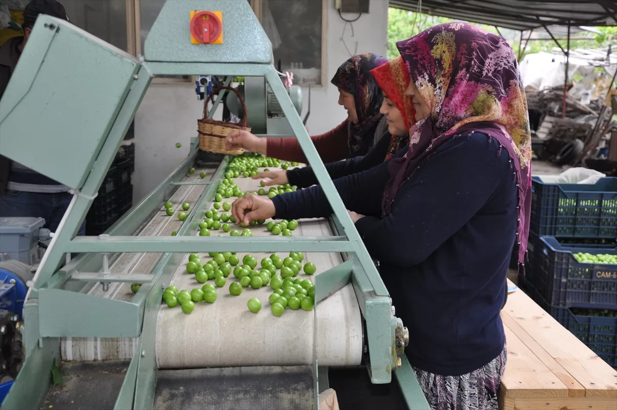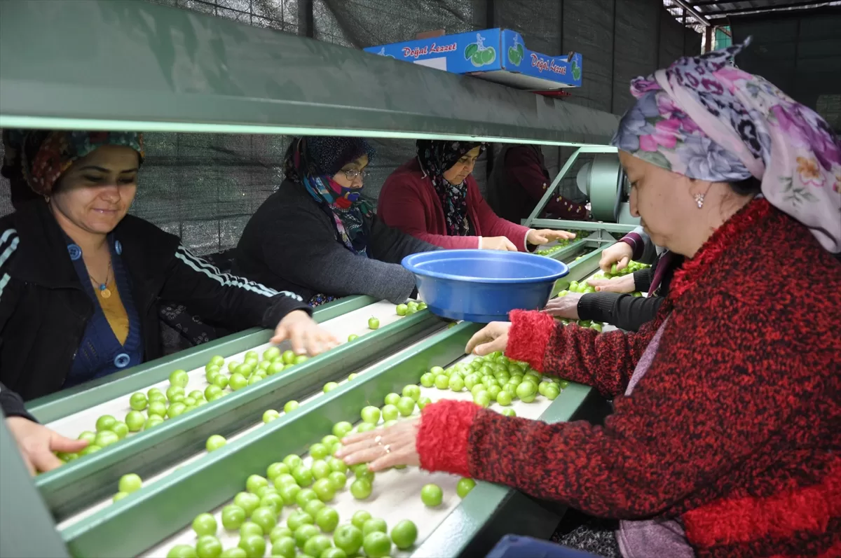 Tarım işçilerince dallarından toplanan erikler, makine yardımıyla boylarına göre paketlere ayrılıyor.