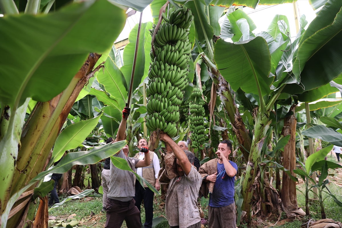 Üreticilerle ve işçilerle sohbet eden Pehlivan, olgunlaşmış ağaçlardan muz kesti.