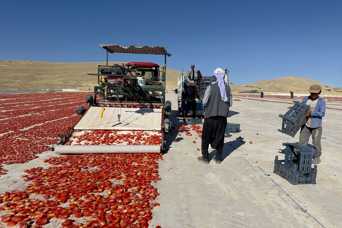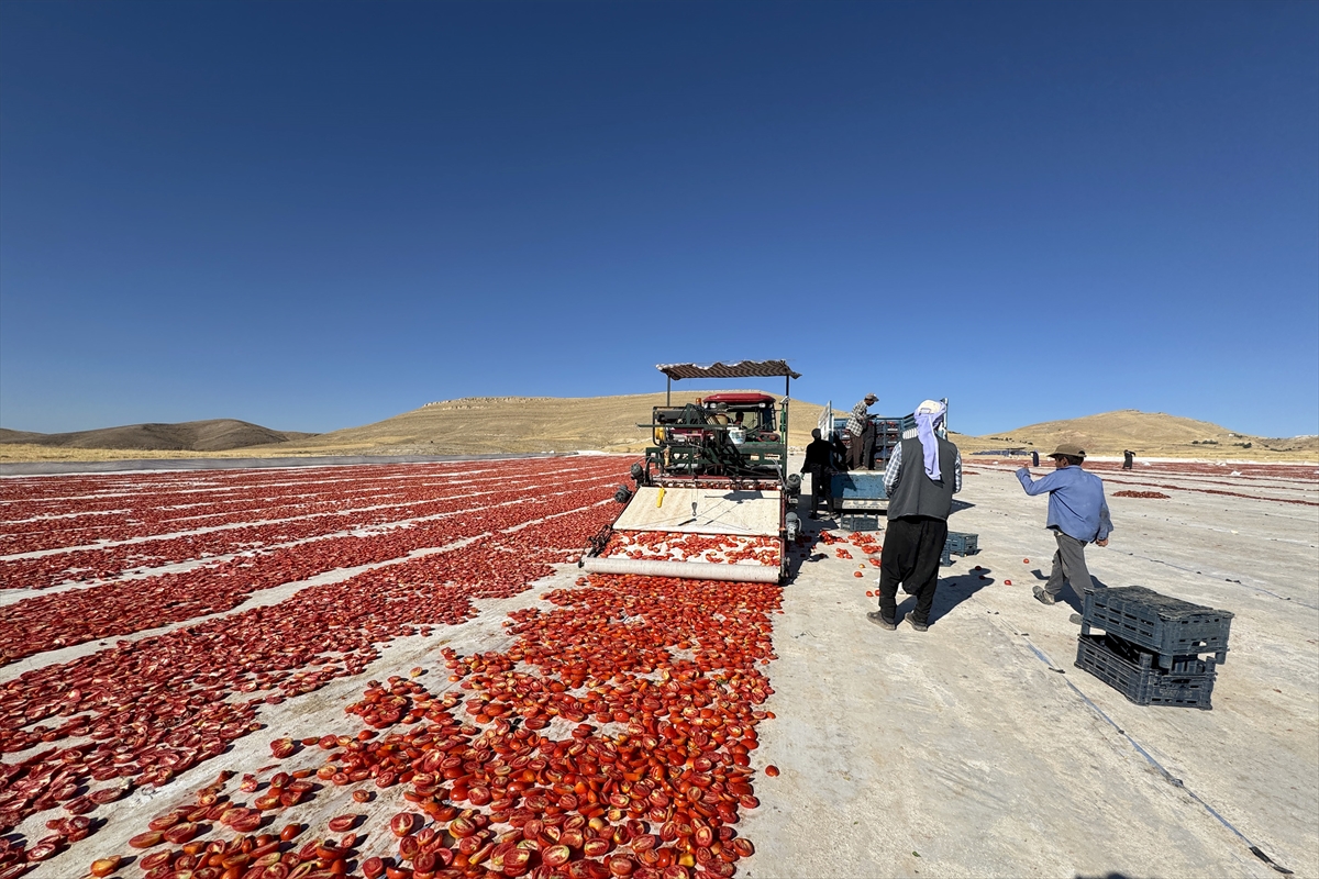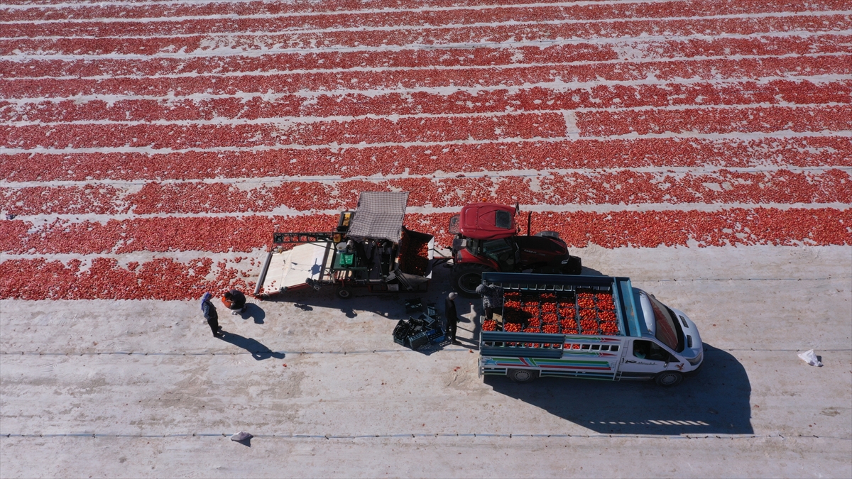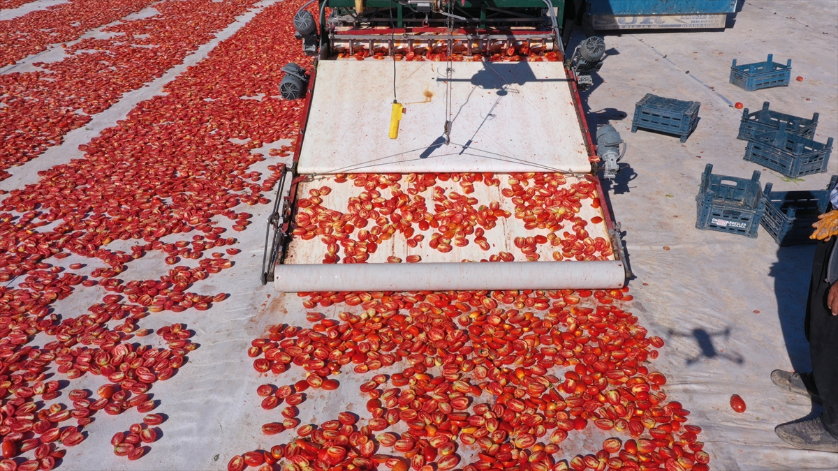 Tarlalarda hasadı süren domatesler, araçlarla kurutulmak üzere getirildikleri alanda makinelerle ikiye bölünerek örtüye seriliyor.