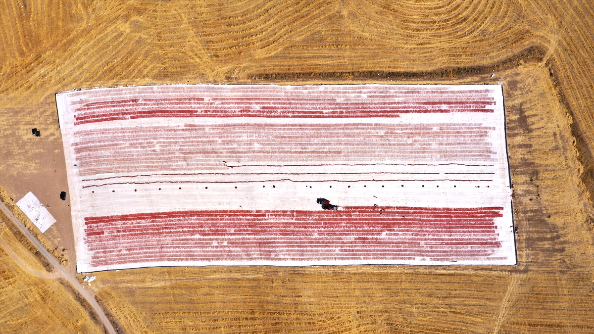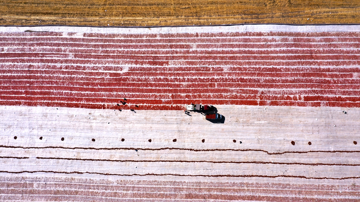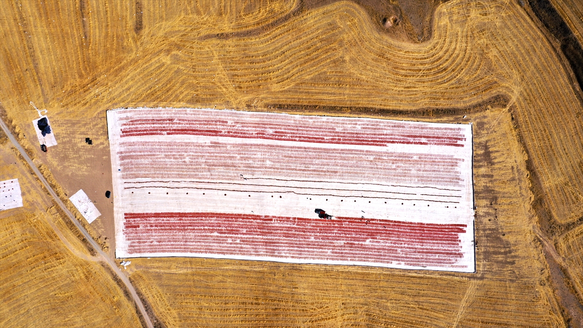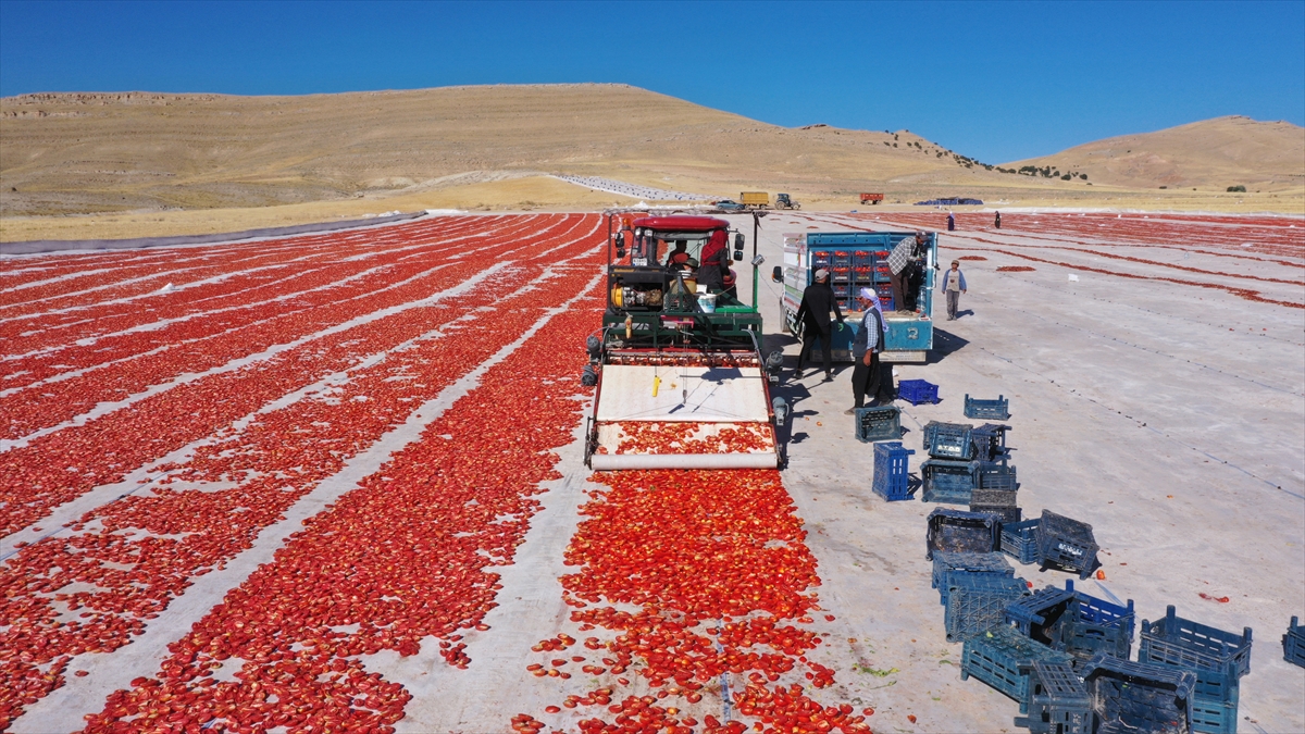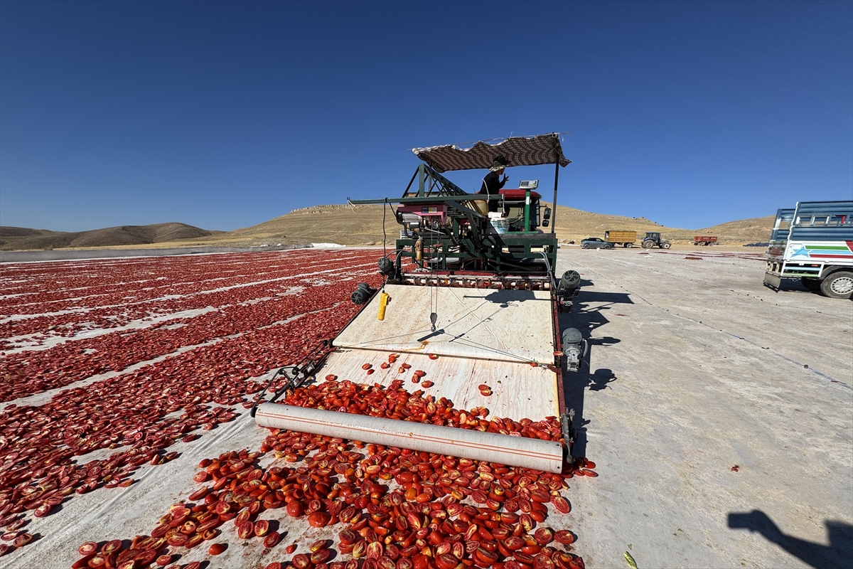 Tarlalarda hasadı süren domatesler, araçlarla kurutulmak üzere getirildikleri alanda makinelerle ikiye bölünerek örtüye seriliyor.