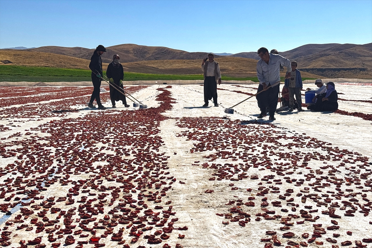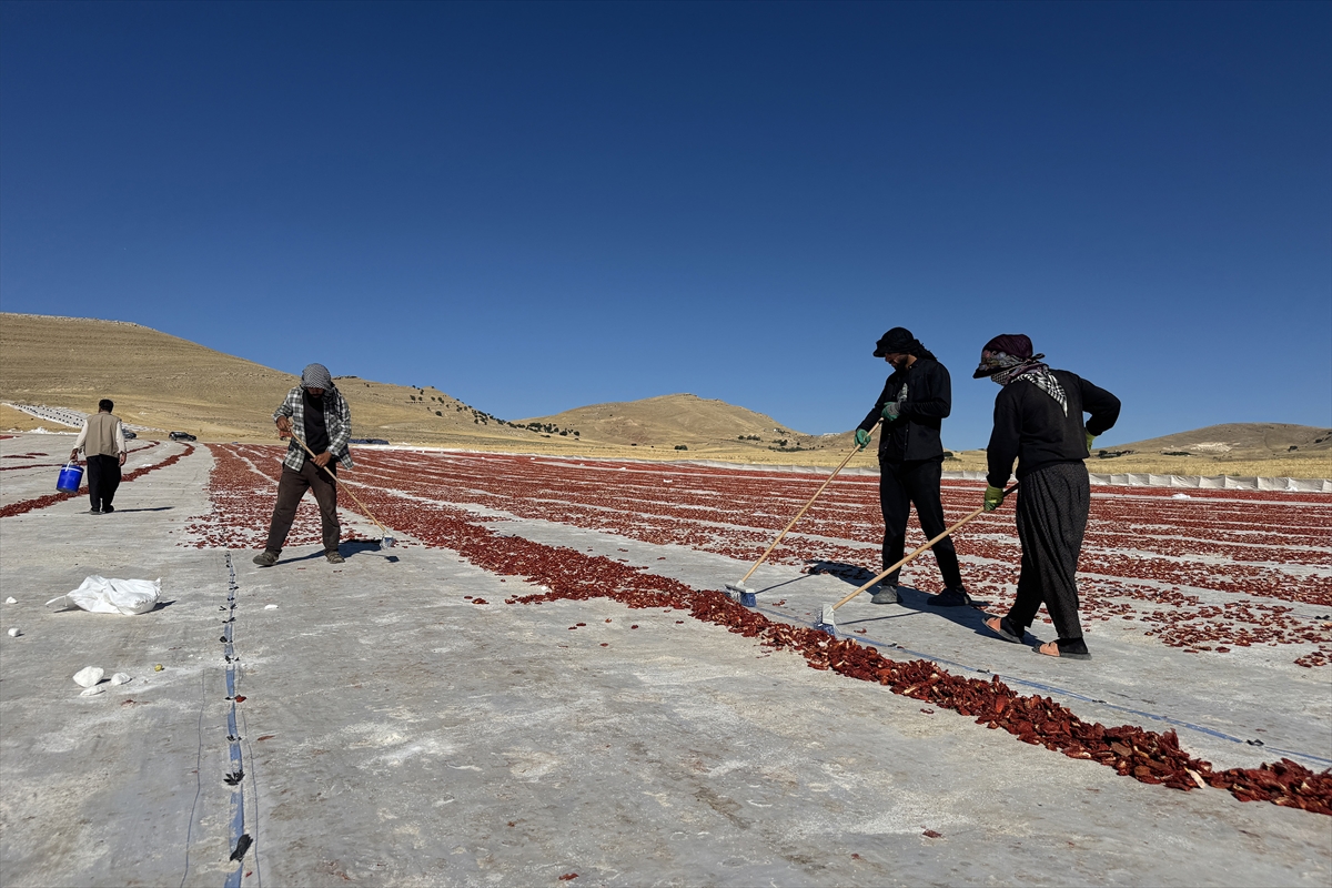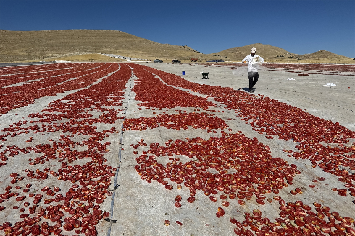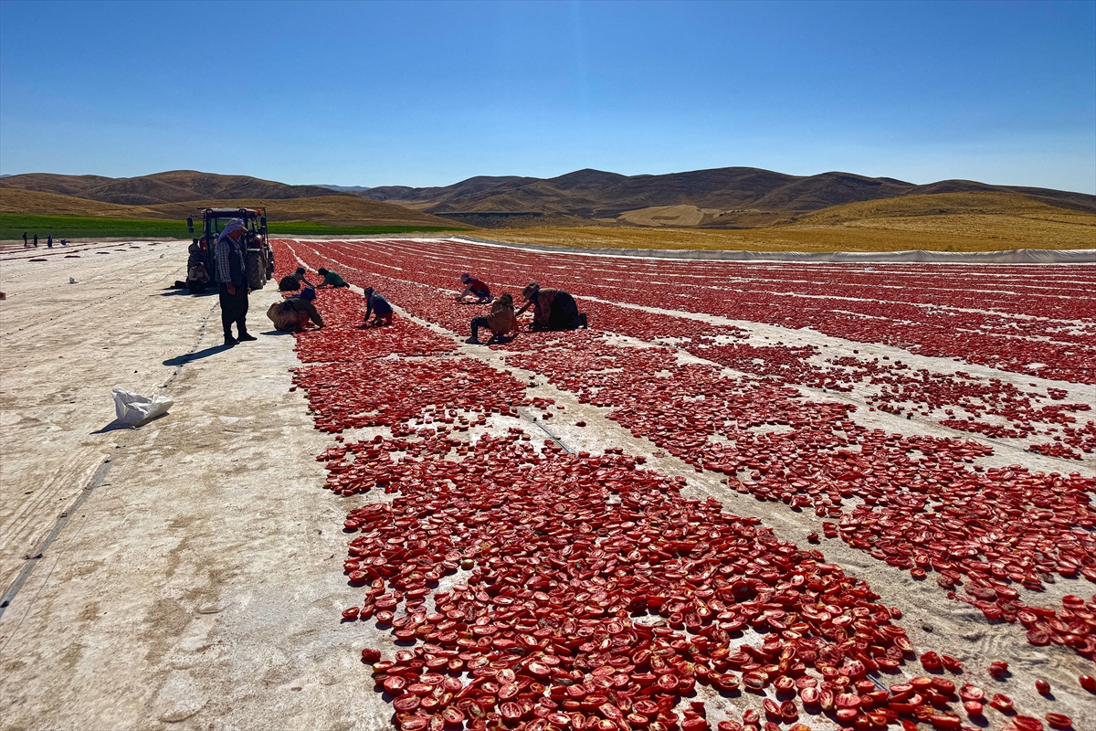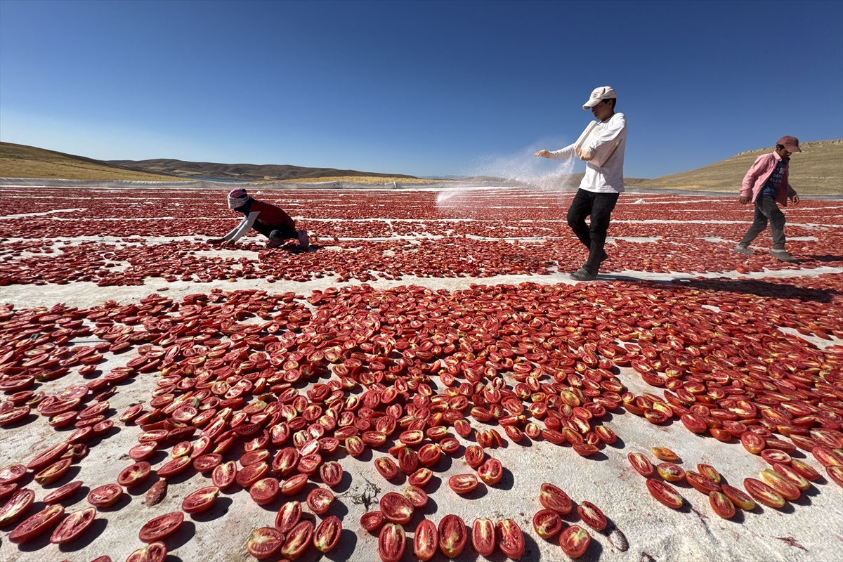 Kuruması için güneşe bırakılan domatesler, işçiler tarafından tuzlanıyor.