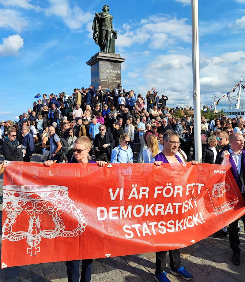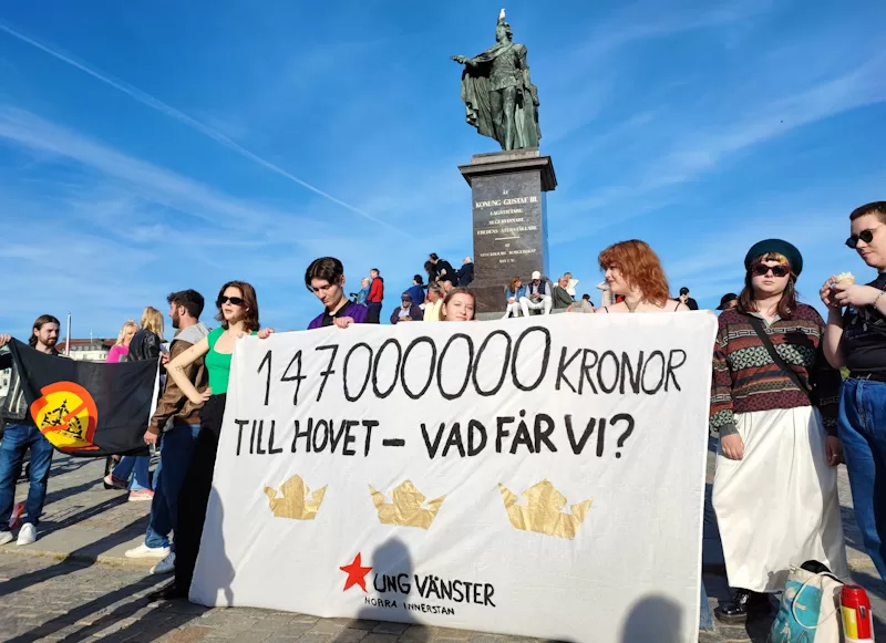 Monarşi’ye karşı olan gençler ‘Krallığa 147.000.000 İsveç Kronu (Yaklaşık olarak 400 milyon Türk Lirası) fakat biz ne alıyoruz ? ‘ sloganı taşıyan bir pankart açtılar. Kral’ı protesto edenlerin bir hayli kalabalık olduğu gözlendi.