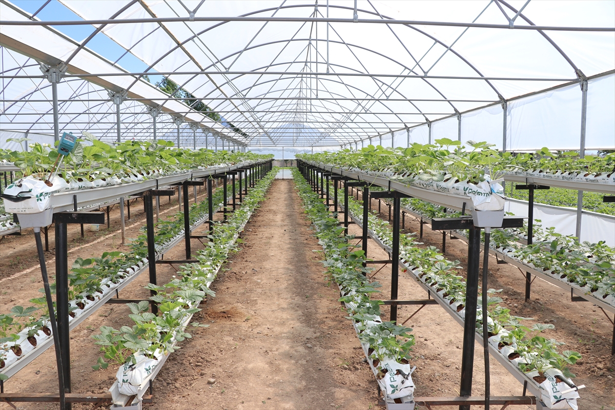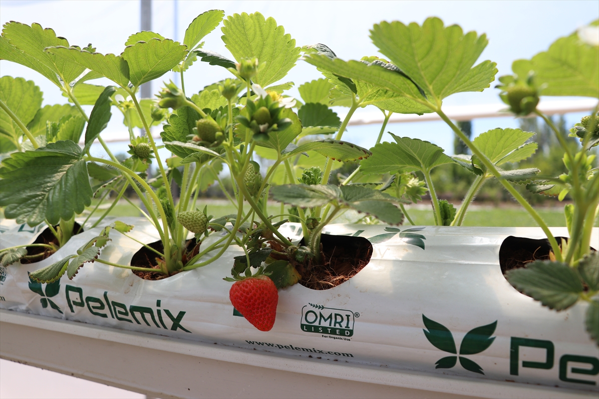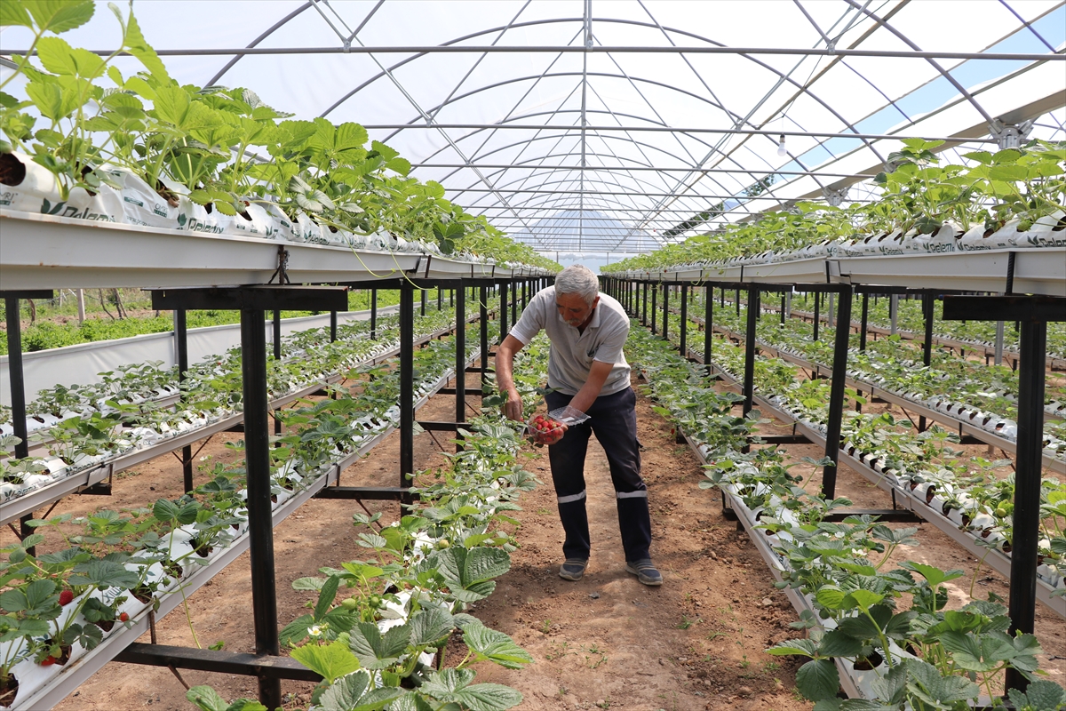 NİĞDE (AA) – Niğde'nin Altunhisar ilçesinde Ramazan Tüzün, yüzde 70 hibe desteği ile kurduğu topraksız tarım serasında ilk çilek hasadına hazırlanıyor.