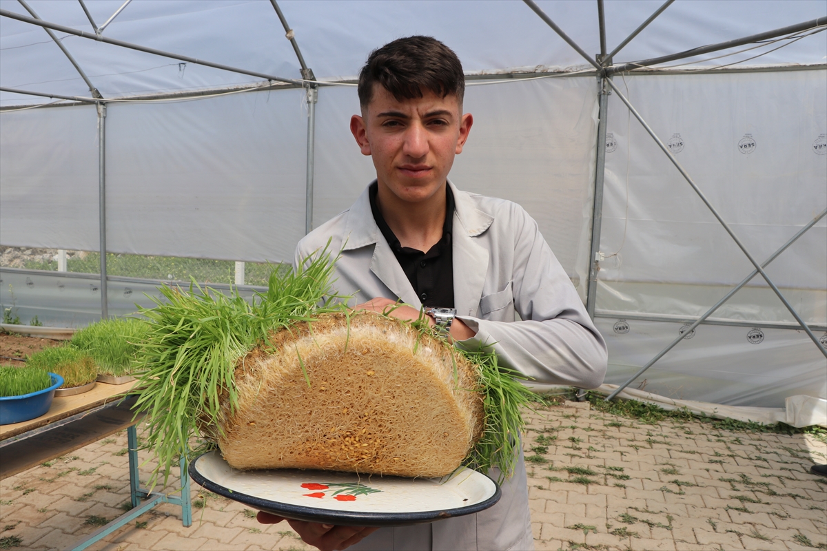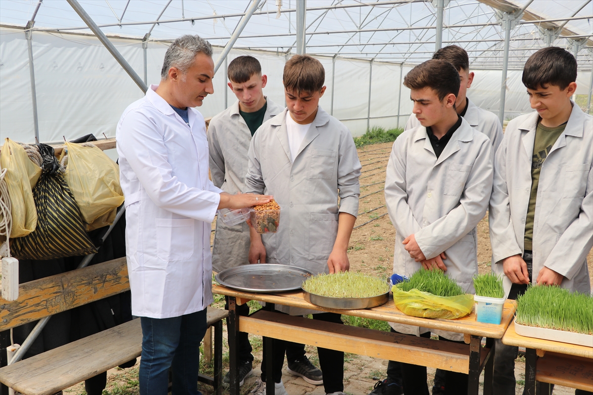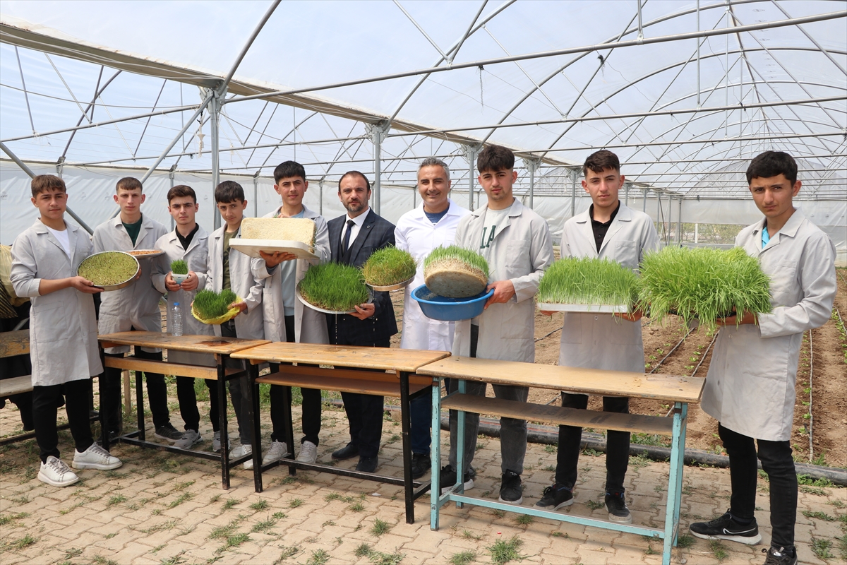 Okulun tarım teknolojileri bölümü öğrencileri, öğretmenleri Halit Alkan'ın öncülüğünde arpa tohumlarını kullanarak sera içerisinde 15 günde yeşil yem elde etti.