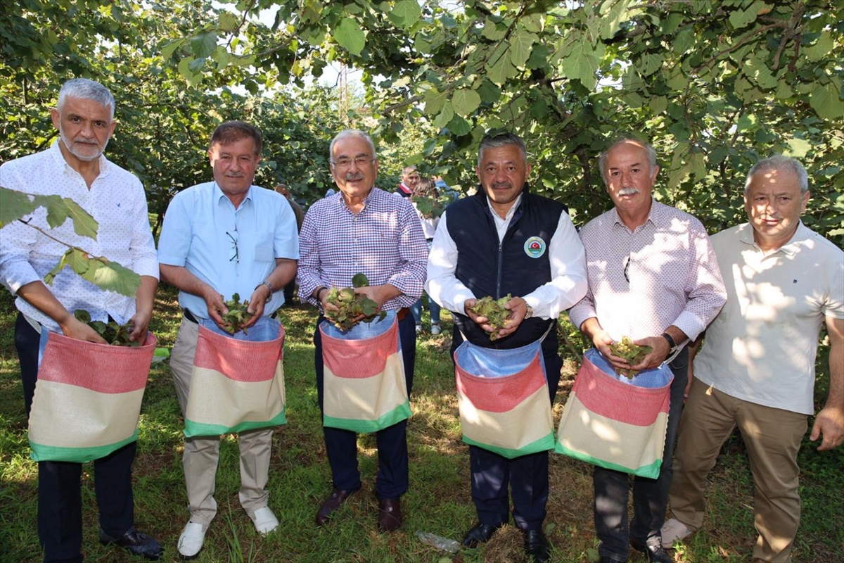 İl Müftüsü İsmail Çiçek'in dua etmesinin ardından bahçede bulunan işçilerle fındık toplayan Vali Erol, bahçe sahibi Nedim Uzunçakmak'a bol kazanç temennisinde bulundu.