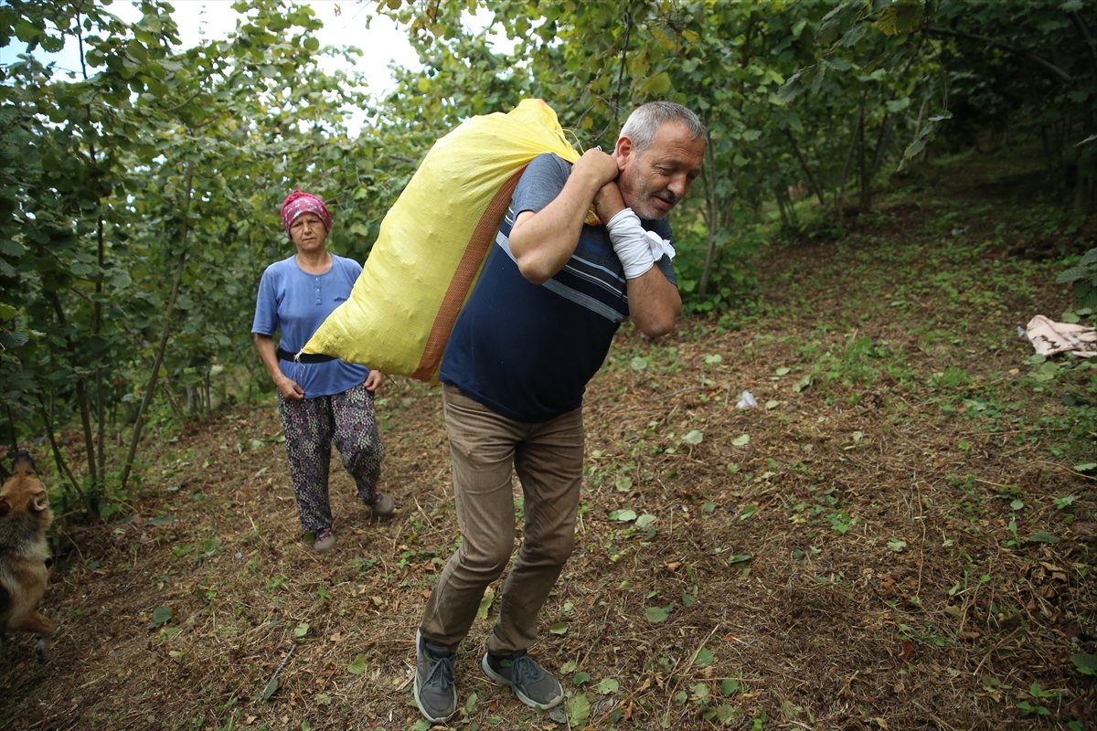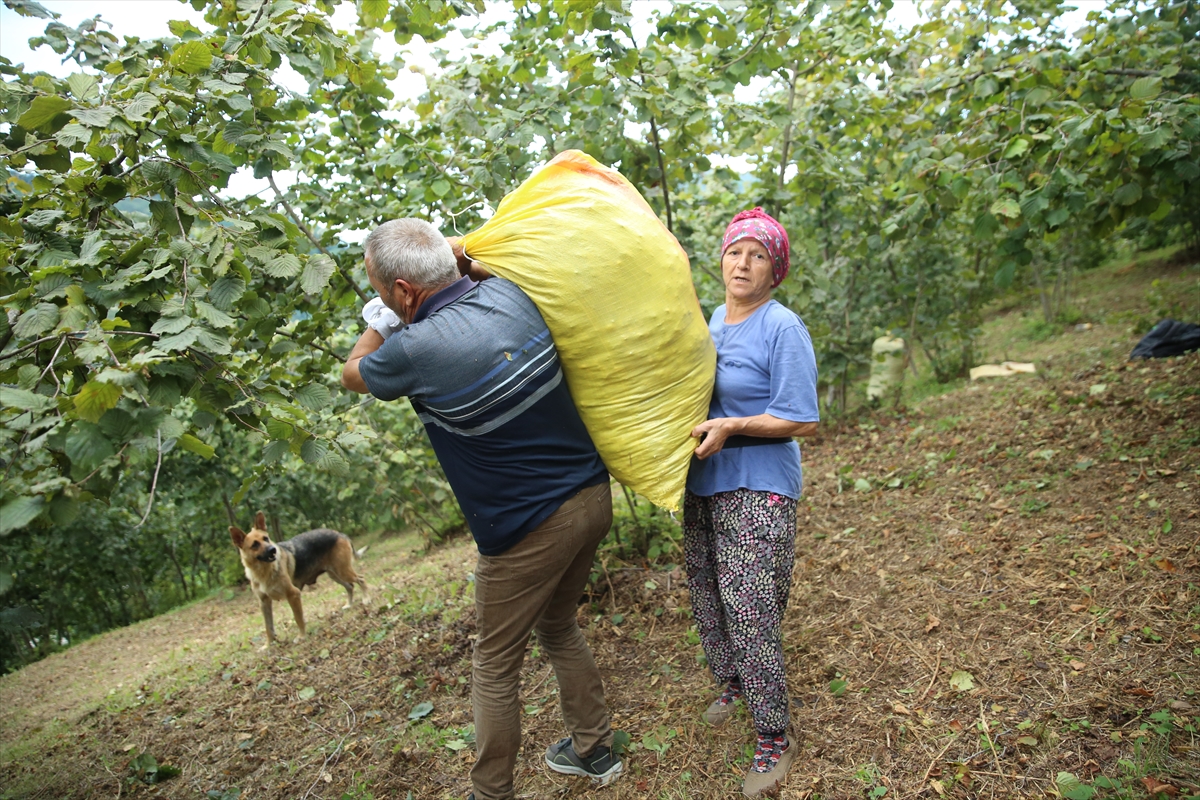 Sabahın erken saatlerinde bahçeye giren üreticiler, topladıkları fındıkları çuvallarla harmana taşıyor.