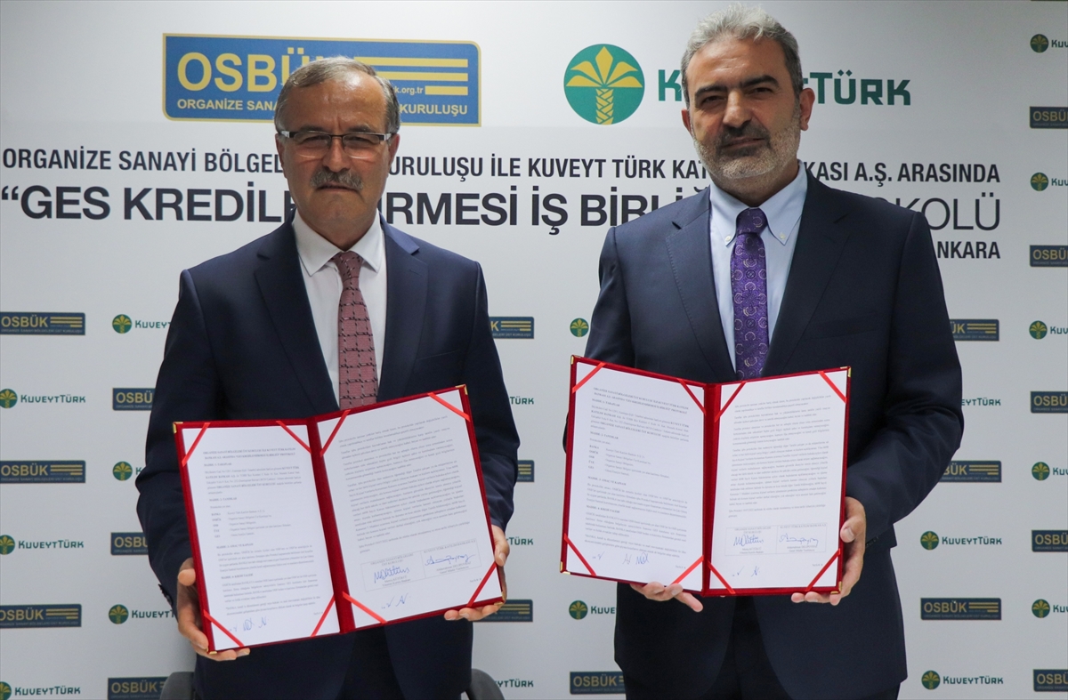 ANKARA (AA) – Organize Sanayi Bölgeleri Üst Kuruluşu (OSBÜK) ile Kuveyt Türk Katılım Bankası arasında, organize sanayi bölgelerinin ve katılımcılarının çatı güneş enerjisi santrali yatırımlarına uygun finansman imkanı sağlayacak "Güneş Enerjisi Santrali (GES) Kredilendirmesi İş Birliği" protokolü imzalandı.