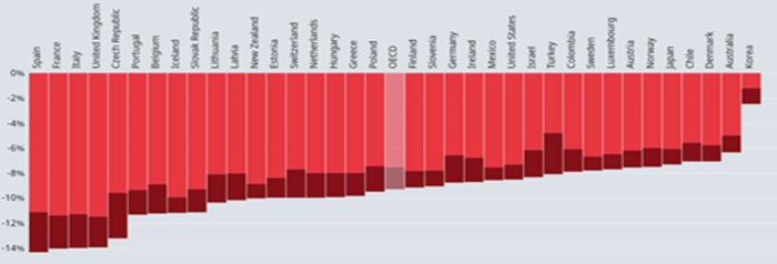 OECD verilerine göre yılsonu itibarı ile ekonomideki küçülme oranlarını gösteren tablodaki açık renk alanlar yanında muhtemel ikinci dalganın etkisi koyu renkte gösteriliyor. Bu veriler doğrultusunda 2020 sene sonu itibarı ile gelişmiş ekonomilerin ortalama yüzde 8-10, gelişmekte olan ülkelerin ise ortalama yüzde 3-4 civarında küçülecekleri tahmin ediliyor.
