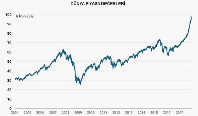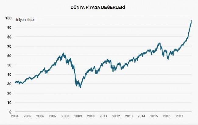 Bloomberg ve yatırım şirketi Goldman Sachs’in yayınladığı son verilere göre, küresel piyasa değerleri rakamları yaklaşık 100 trilyon dolara ulaşmaya yaklaşırken, son rakamların 2017’nin piyasa zirvesini göstereceğini gösteriyor. Şu ana kadar elde edilen değerler, 2008’deki ekonomik krizde yaşanan azalma dışında sabit ve istikrarlı olarak ilerlerken, 2017 yılındaki dünya piyasa değerleri hızlı bir artış göstererek uzmanları endişeye düşürüyor.