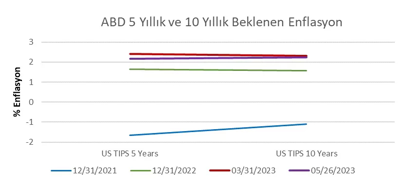 Asıl ilginç olan ise ABD tahvil piyasasının hisse senedi piyasalarıyla süregelen fikir ayrılığı. Sene başındaki gibi, tahviller FED oranlarının bir süre daha yüksek seyretmesini ve enflasyonun da uzun vadede ama oldukça yavaş bir şekilde düşmesini bekliyor. Piyasa oyuncularının faizlerle ilgili beklentilerinin nasıl değiştiğini daha iyi anlamak için tahvil piyasalarının 5 ve 10 yıllık enflasyon beklentilerinin 2021 sonundan bu yana nasıl değiştiğine aşağıdaki grafikte bir göz atalım. Beklenen enflasyon, nominal faizlerin göstergesi olan ABD tahvilleri ve reel faiz oranlarının göstergesi olan ABD Hazine Enflasyon Korumalı Menkul Kıymetler (Treasury Inflation-Protected Securities or TIPS) kullanılarak hesaplanır. Ayni vadeli iki faiz oranı arasındaki fark, beklenen (veya başa baş) enflasyonu verir (yani, nominal faiz – reel faiz = beklenen enflasyon).