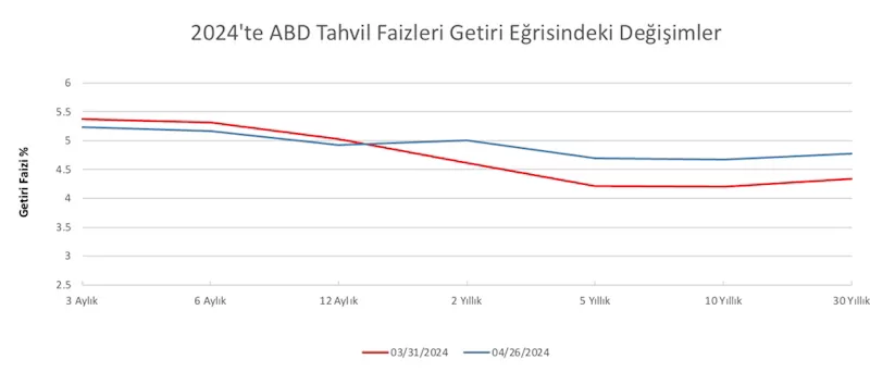 Nisan ayındaki uzun vadeli tahvil fiyatları da hisse senetlerine benzer bir düşüş yaşadı. Ancak hisse senetlerinin aksine bu durum piyasadaki havanın tersine dönmesiyle tetiklenmedi. Bu, daha ziyade önceki dönemin bir devamıydı. Çünkü önceki birçok sayımızda da ayrıntılı olarak tartıştığımız üzere tahvil piyasaları zaten faiz oranlarının bir süre daha yüksek seyretmesini bekliyordu. Nisan ayında tahvillerde yaşanan tek hareket ABD tahvil faizi getiri eğrisinin (aşağıdaki grafikte mavi çizgi), Mart ayına (kırmızı çizgi) kıyasla biraz düzleşmesi oldu. Bu da, grafikte de görüldüğü üzere kısa vadeli tahvil faizler düşerken uzun vadeli faizlerin artması anlamına geliyor.