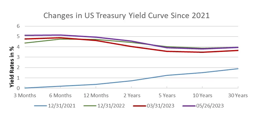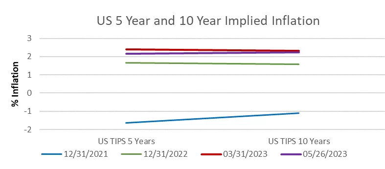 This actually makes sense because FED has been saying they are not done until they beat inflation. Yet, given they have gone from 75 bps rate hikes all the way down to 25 bps hikes and are even thinking of pausing, shouldn’t the long term nominal rates come down? They should, but as the chart below shows, that is not what is going on. If you look at the yield curve as of May 26th (see the purple line) it is higher than the one two months ago (red line) and front end is higher than the one at the end of 2022 (green line). That has two meanings. First, markets expect not just the FED rates or inflation but also the nominal (or bond) interest rates to remain elevated all the way into the future. Second, over time markets’ expectation of nominal rates has gone up contrary what the FED has been trying to achieve, i.e. lower both inflation and nominal rates.