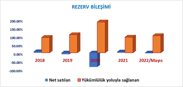 Yoğun döviz satışları nedeniyle 2020 yılının Nisan ayından itibaren Merkez Bankası’nın net döviz rezervleri eksi değere dönüştü. Türkiye’nin brüt rezervleri, o tarihten bu yana sadece yükümlülükler yoluyla sağlanan dövizlerden oluştuğu için brüt rezervler pozitif olarak gözükse bile net rezervler negatif değerini sürdürüyor. Merkez Bankası’nın döviz rezervleri, 2022’nin Mayıs ayı itibariyle brüt olarak 101,6 Milyar USD, net olarak ise (-)39.8 Milyar USD (eksi)’dir.