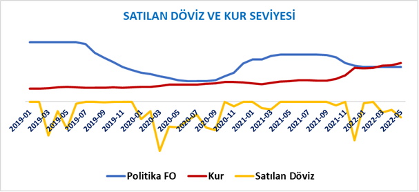 Düşük faiz uygulamalarının döviz fiyatları üzerinde yarattığı yukarı yönlü baskının azaltılması için faiz politikalarının gözden geçirilmesi ve küresel gelişmelere de paralel olarak artırılması gerekirken, rezerv satışlarıyla Türk Lirası savunulmaya çalışılıyor. Bu şekilde uygulanan döviz satışlarına dayalı savunma yöntemlerinin Türkiye ekonomisi açısından teknik ve teorik olarak kalıcı sonuç üretmesi olanaksızdır. Zira aşağıdaki grafikte de görüleceği üzere, politika faiz oranlarının düşürüldüğü ve döviz satışlarının periyodik olarak yoğunlaştığı dönemler de bile kur seviyesinin yukarı yönlü eğilimi mütemadiyen hep devam etti ve döviz satışları beklenen etkiyi yapmadı. Halbuki faiz oranlarının düşürülmemesi ve tam tersi olarak artırılması halinde kur seviyesinin daha dengeli olarak belirleneceği, geçmiş deneyimlerin ve ekonomi biliminin kabul ettiği kesin sonuçtur.