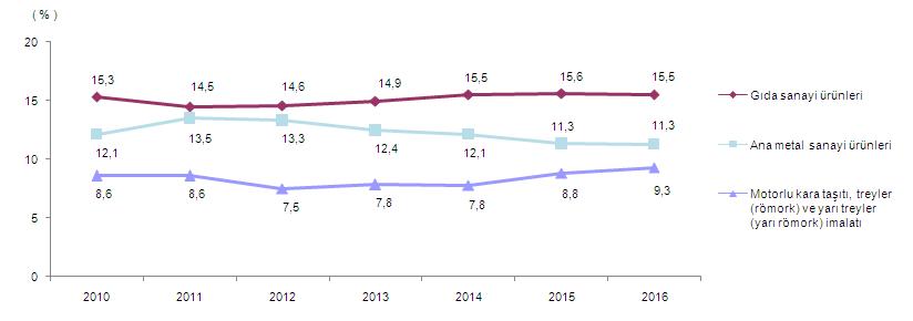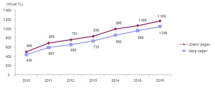 TÜİK verilerine göre, Türkiye’de 2016 yılında 1 milyon 367 bin 725 otomobil üretilirken, 179 milyon 370 bin 200 ton hazır beton, 723 bin 837 ton margarin ve benzeri yenilebilir katı yağ, 8 milyon 405 bin 132 adet ev tipi buzdolabı ve dondurucu üretimi yapıldı.