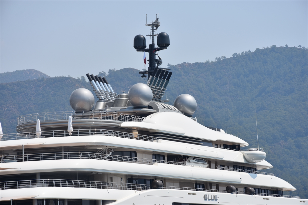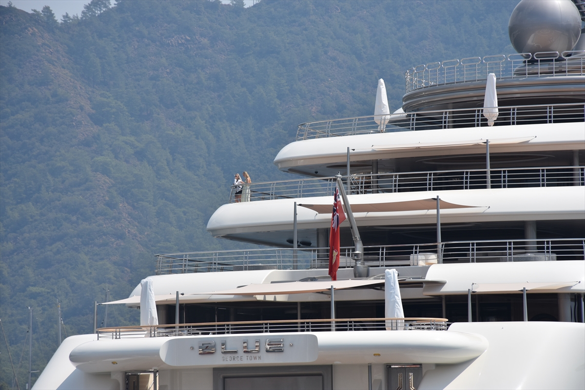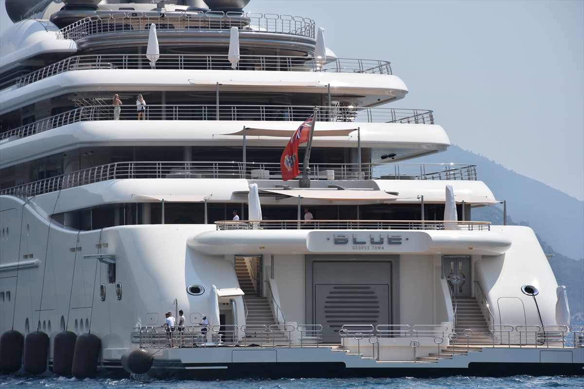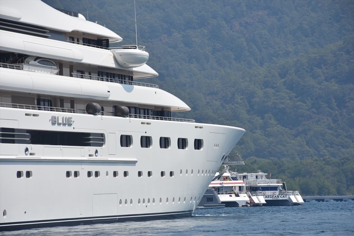 Körfezden limana geçişi ilgiyle izlenen "Blue" isimli yatta, çift helikopter pisti, 9 güverte, plaj kulübü ve yüzme platformu, balkonlu kabinler, su arıtma sistemi, atıksu arıtması ve 80 mürettebat bulunuyor.
