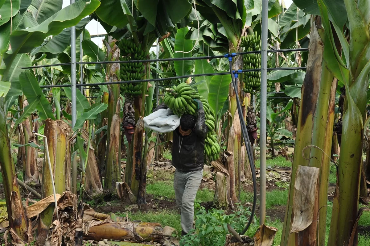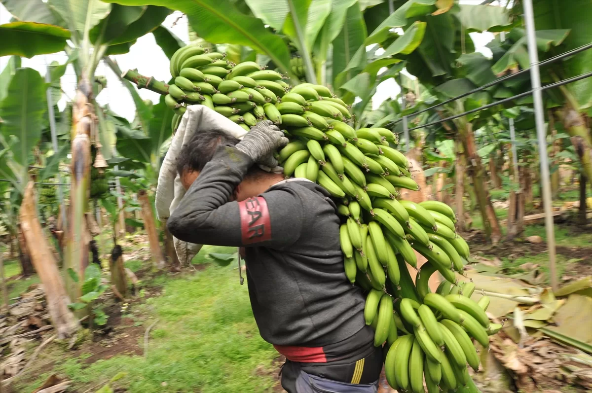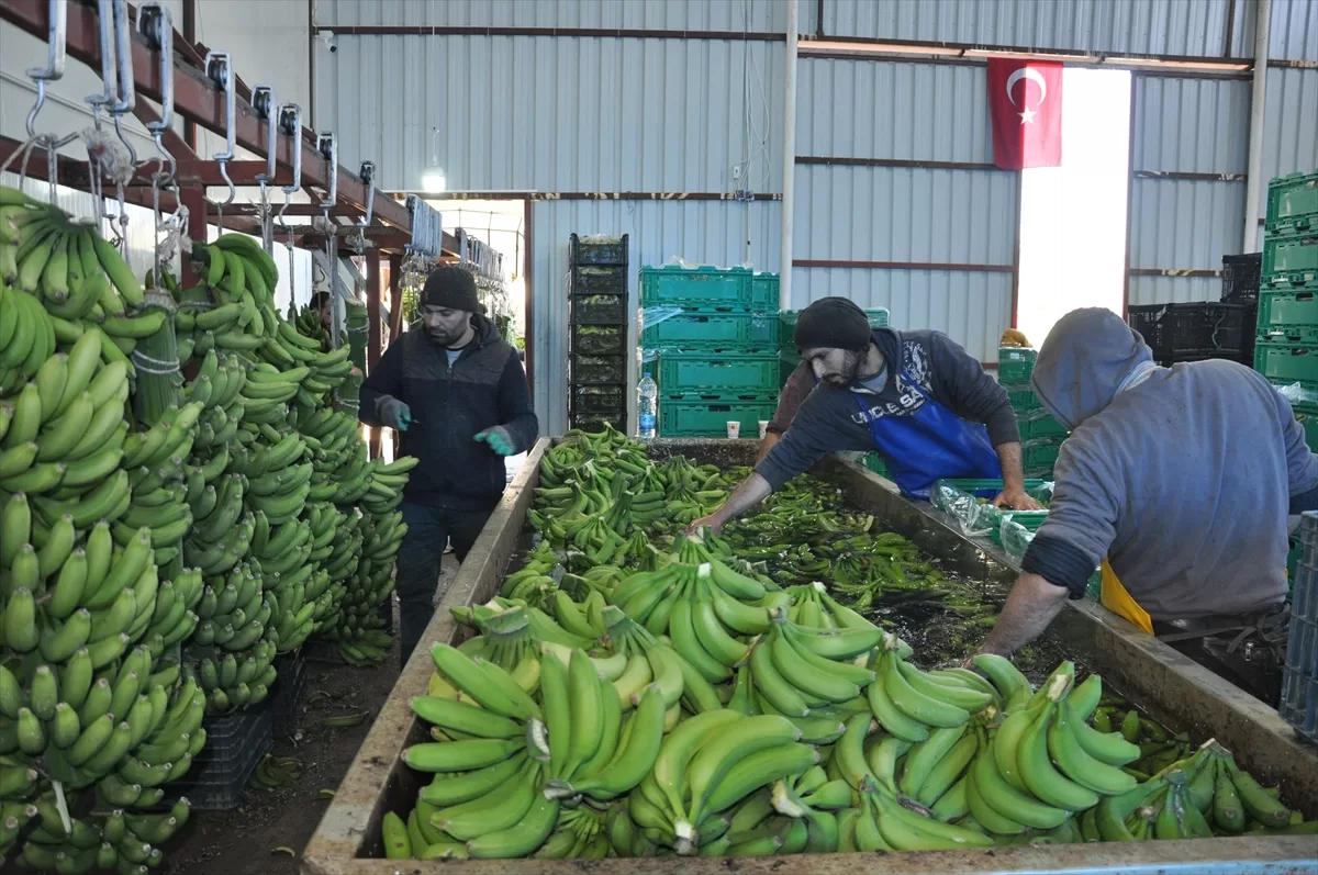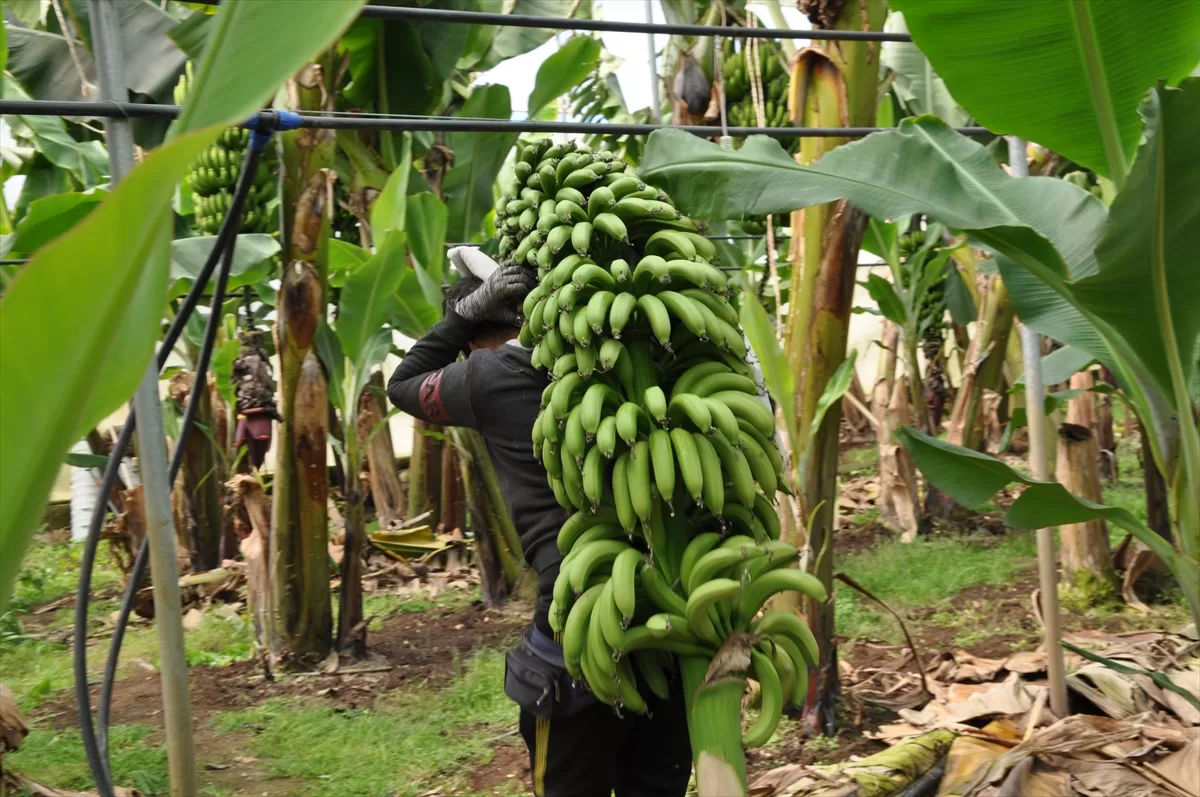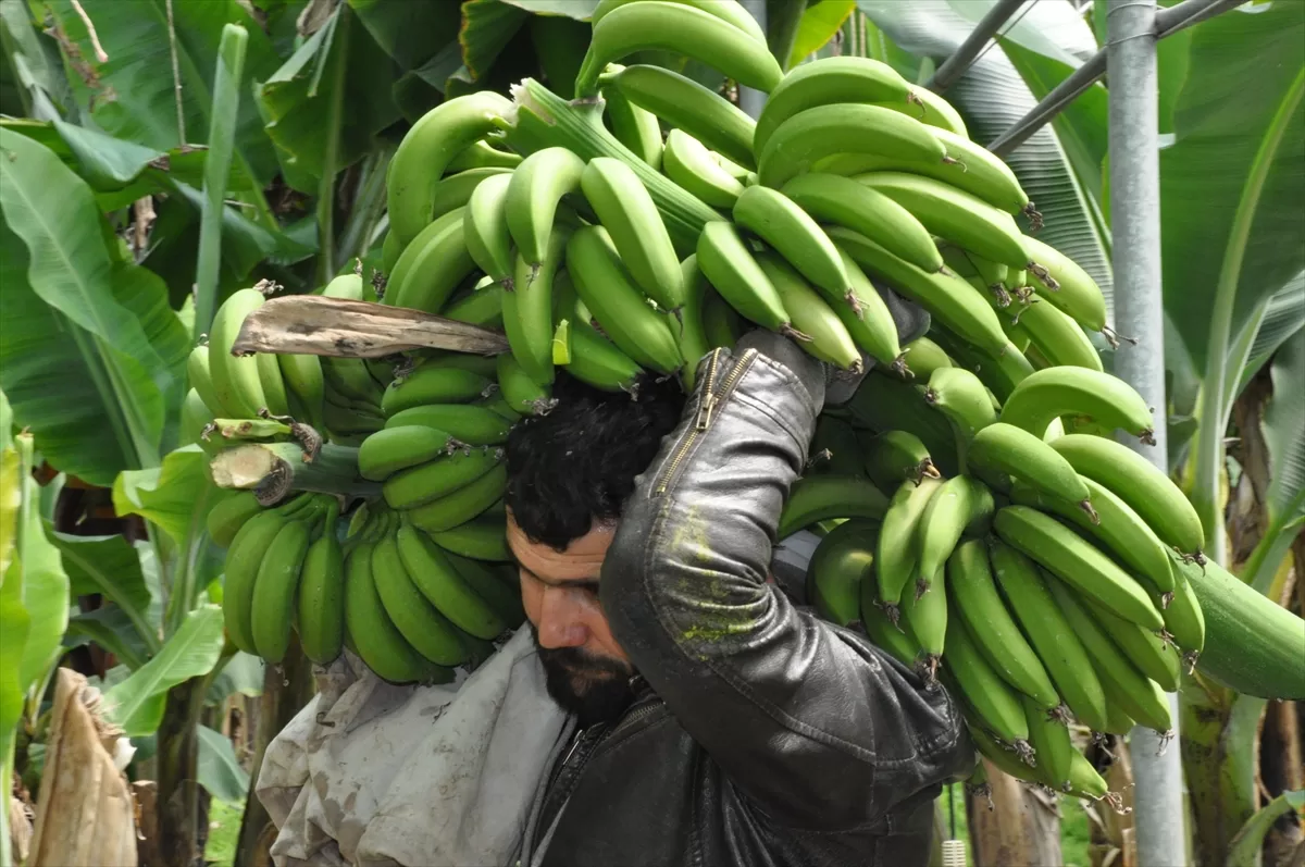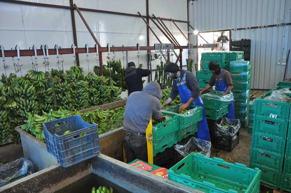 MERSİN (AA) – Türkiye'nin yaş meyve sebze üretim merkezlerinden Mersin'in Silifke ilçesinde, örtü altında 5 bin dönüm alanda yetiştirilen muzda hasat devam ediyor.