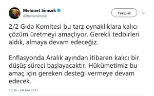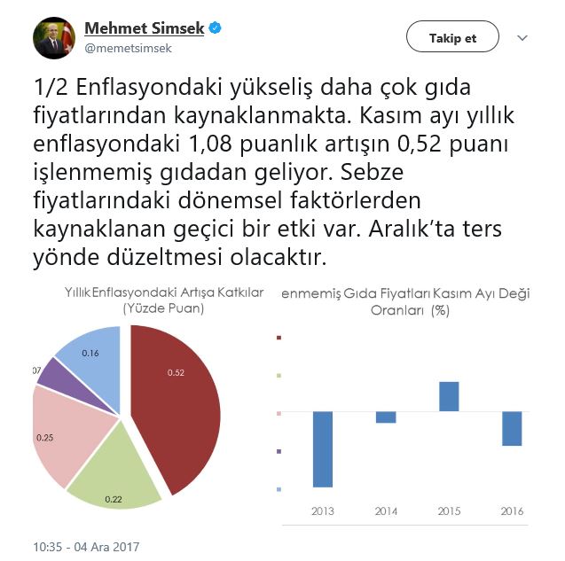 Şimşek, Twitter hesabından yaptığı açıklamalarda enflasyondaki yükselişin daha çok gıda kaynaklı olduğunu belirtti. Enflasyonda Aralık ayından itibaren kalıcı bir düşüş görüleceğini ifade etti.