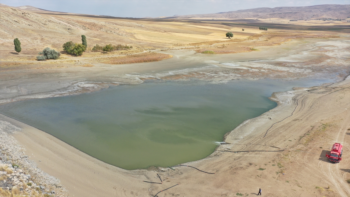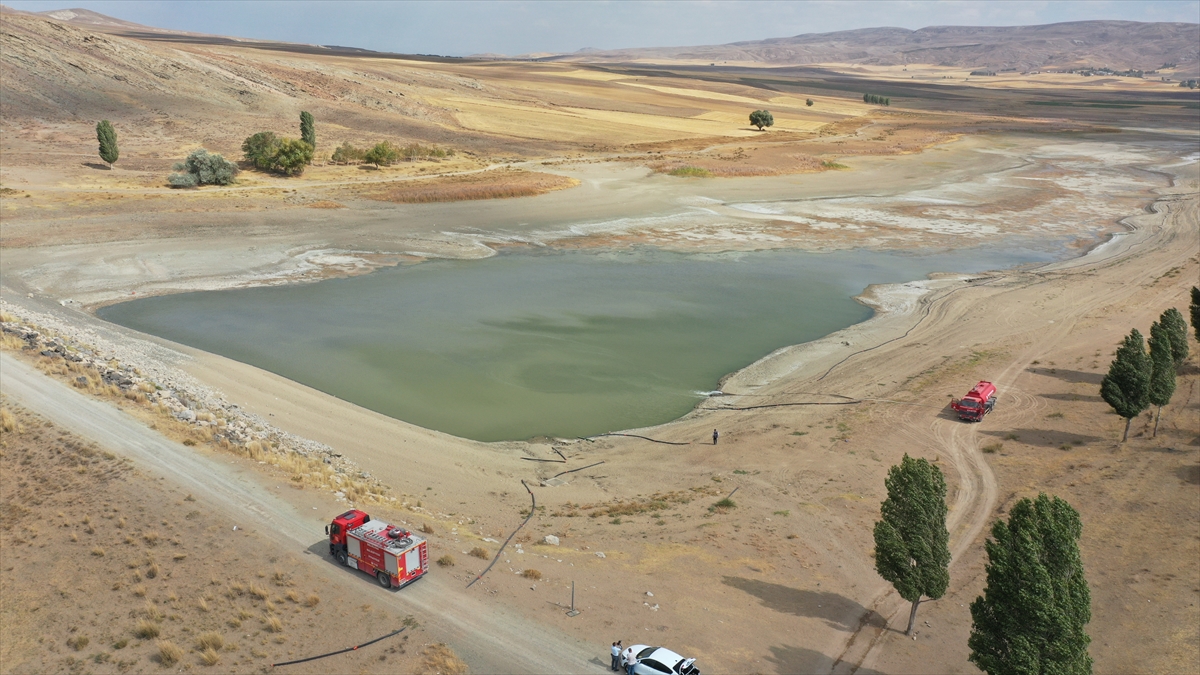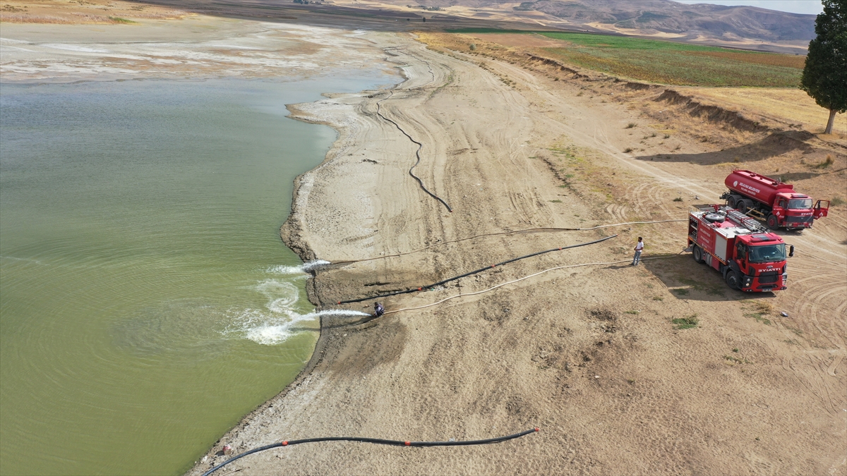 SİVAS (AA) – Sivas'ın Altınyayla ilçesinde kuruyan göle, belediye itfaiye ekiplerince su takviyesi yapılıyor.
