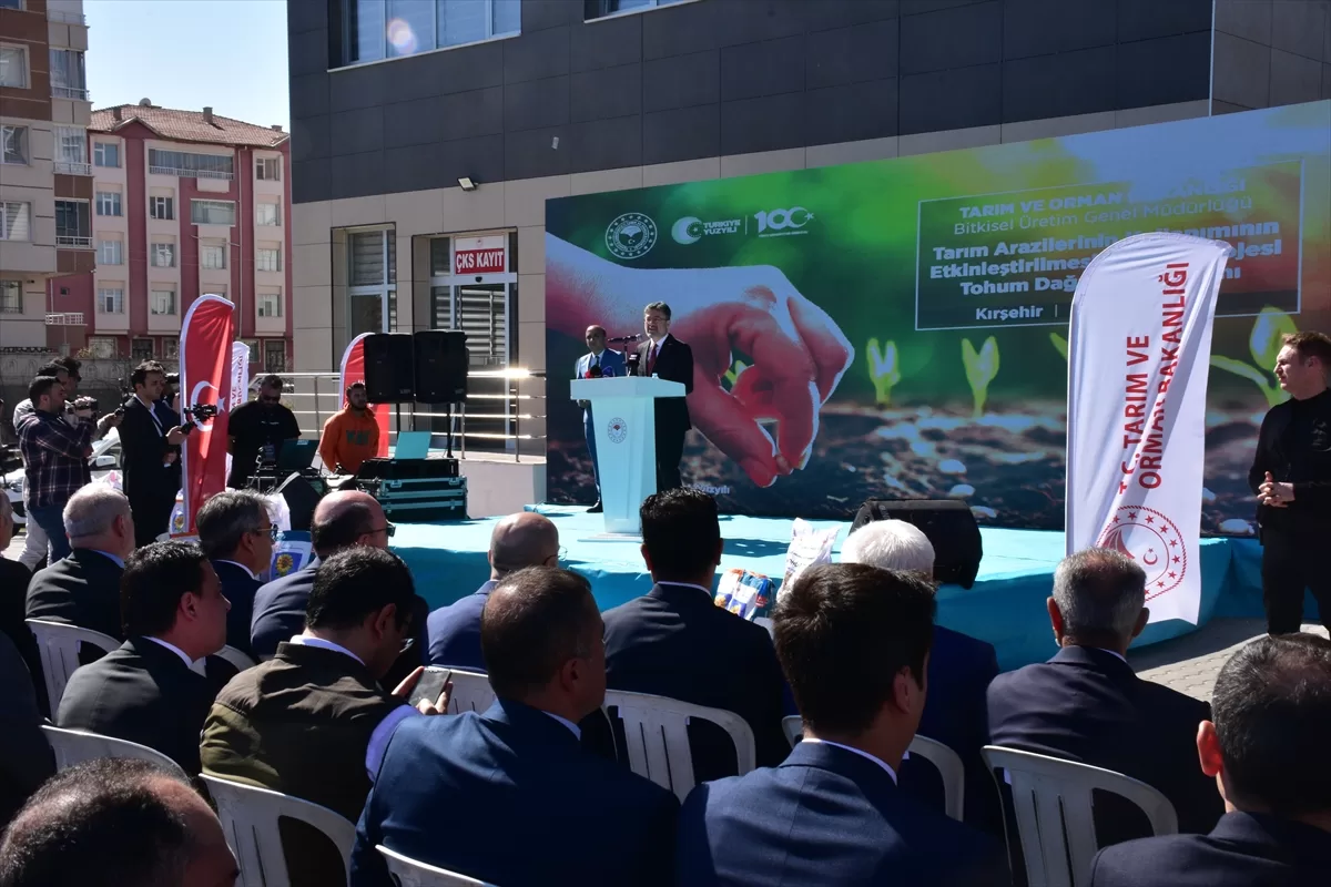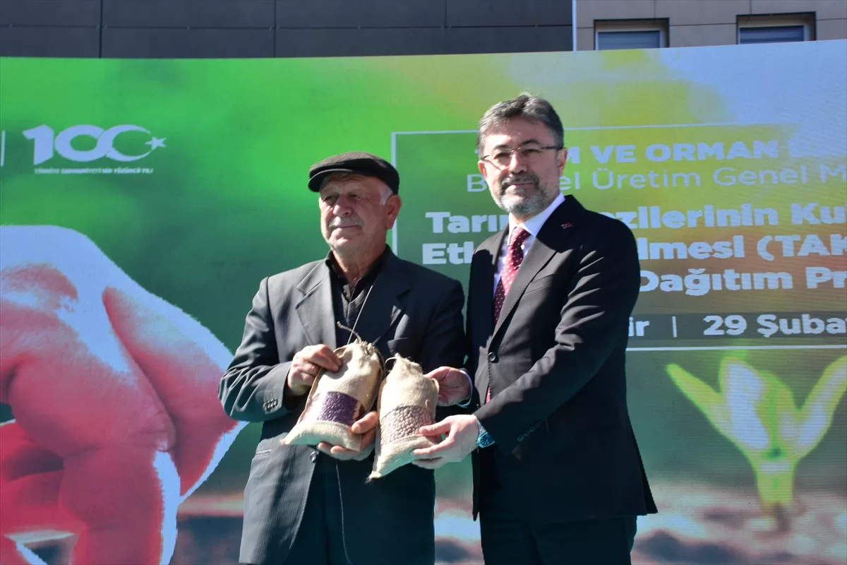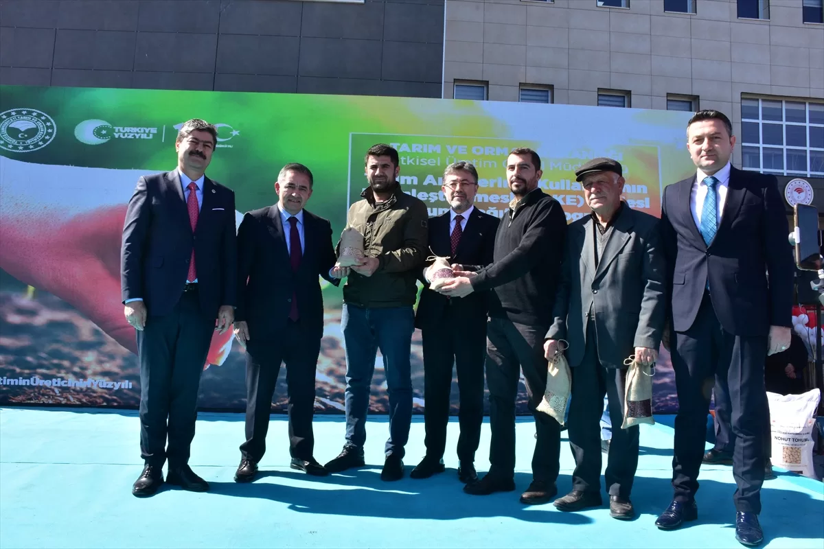 Bakan Yumaklı ve il protokolü, konuşmaların ardından çiftçilere tohum dağıttı.