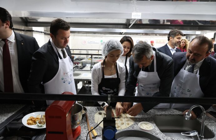 Mutfakta önlük giyen Sezer, öğrencilerle İpsala mantısı ve nişan kurabiyesi yaptı.