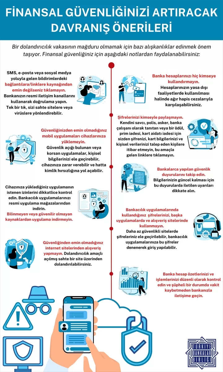TBB, "Finansal Güvenliğinizi Artıracak Davranış Önerileri" konulu infografik çalışması yayımladı. Çalışmada, dolandırıcılık vakası mağduru olmamak için bazı alışkanlıklar edinmenin önem taşıdığına dikkat çekildi.