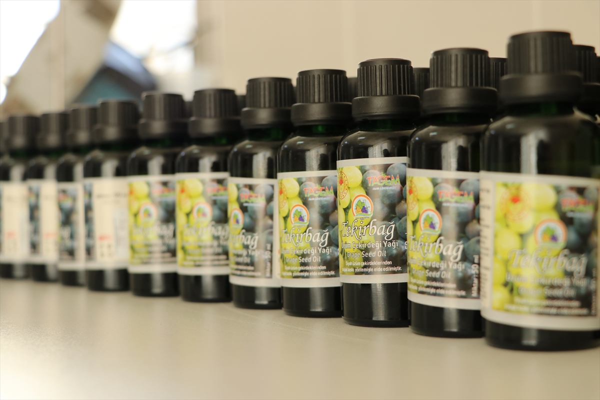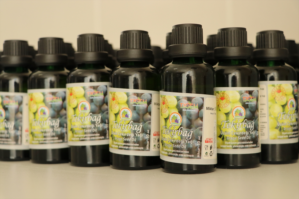 Enstitüde 5 yıl önce başlatılan çalışma kapsamında, üzüm çekirdekleri sıkım makinesinden geçirilerek yağ elde ediliyor. 50 mililitrelik cam şişelere doldurulan yağ, enstitünün kendi mağazalarında satışa sunuluyor.