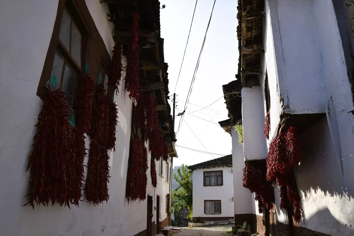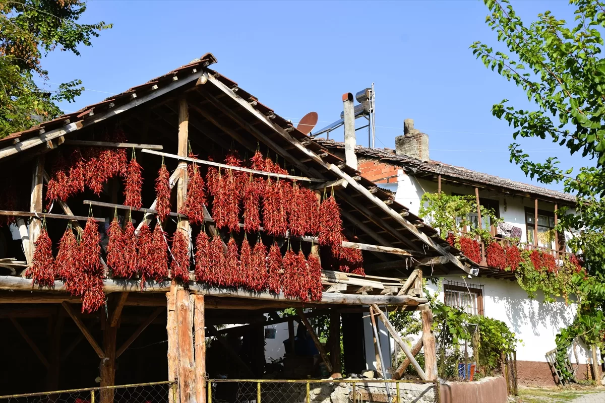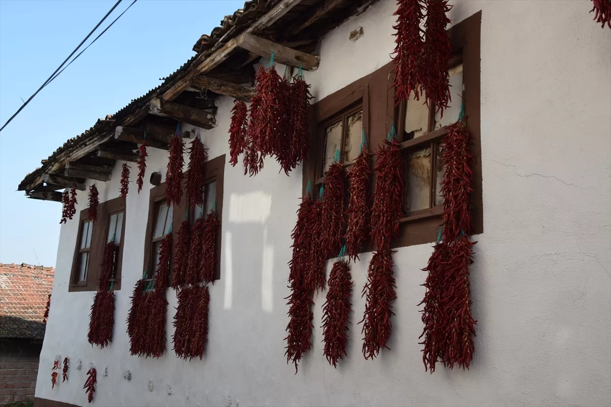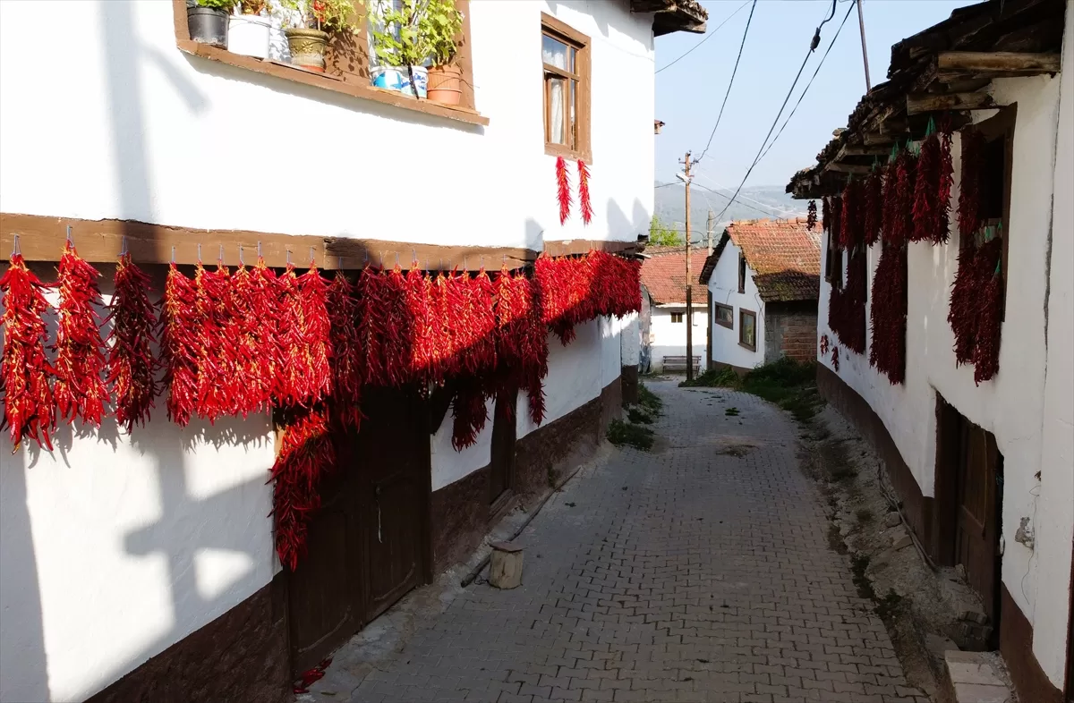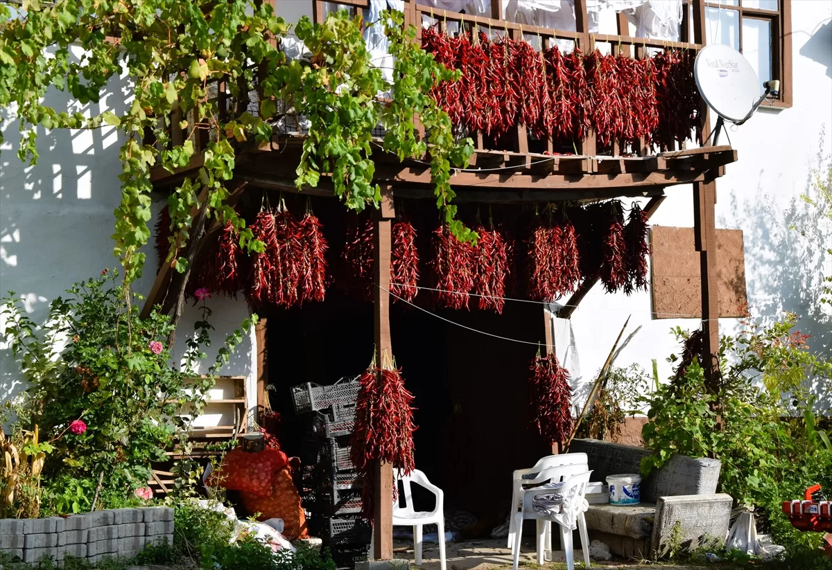 Hemen hemen her evin balkonuna, duvarına, çatısına asılarak kurutulan ve adeta köyü kırmızıya boyayan biberin oluşturduğu görüntü dikkati çekiyor.