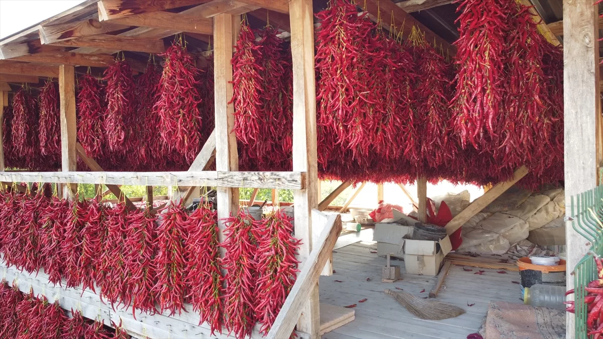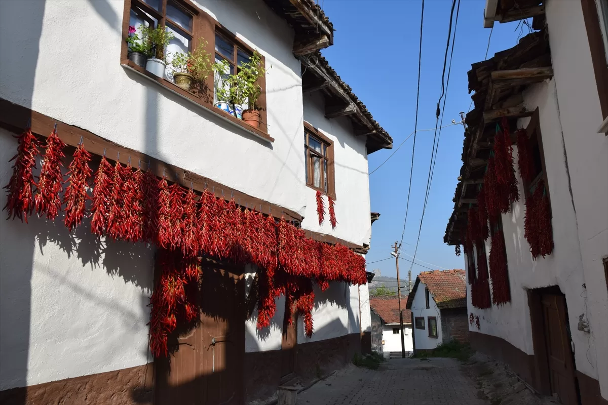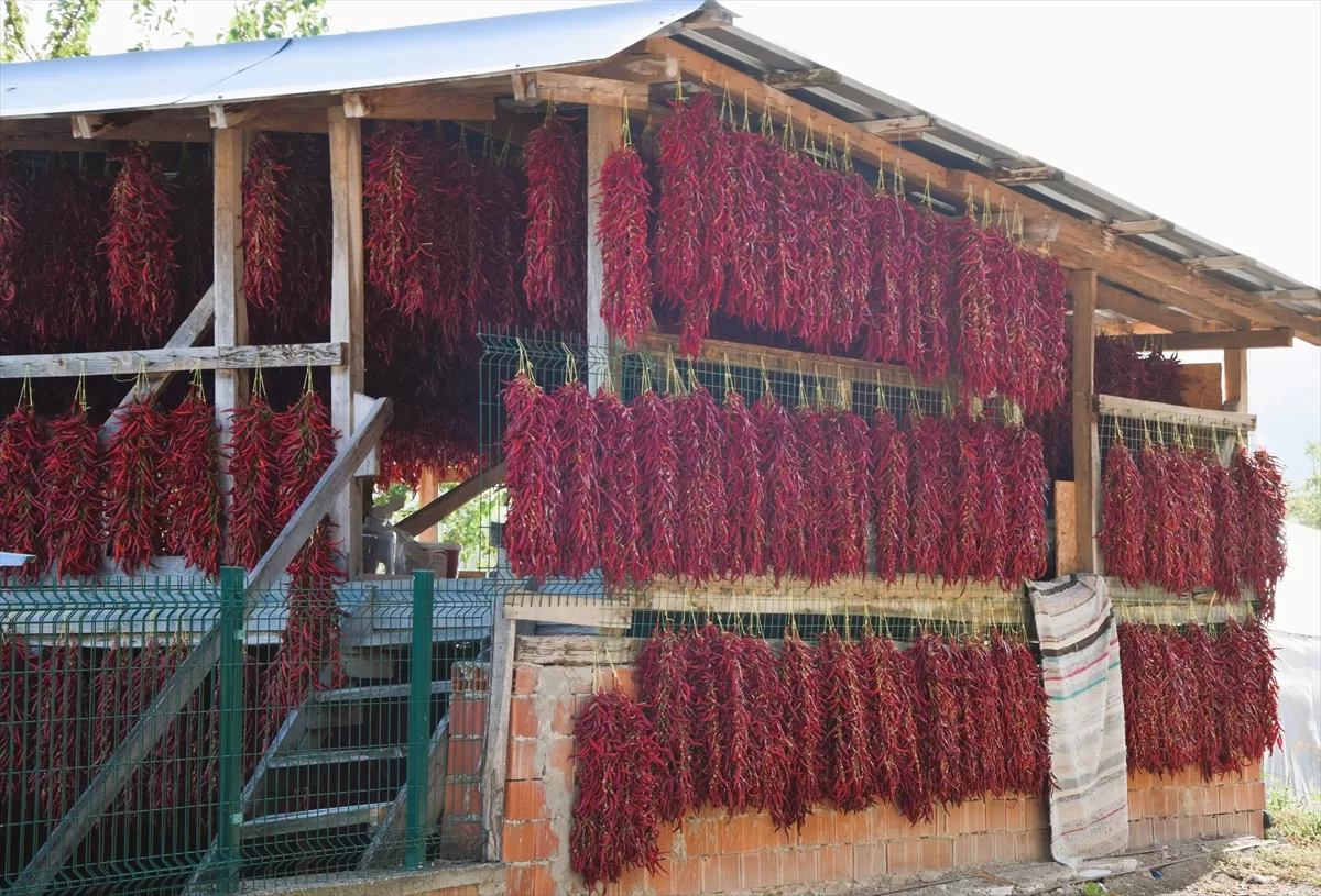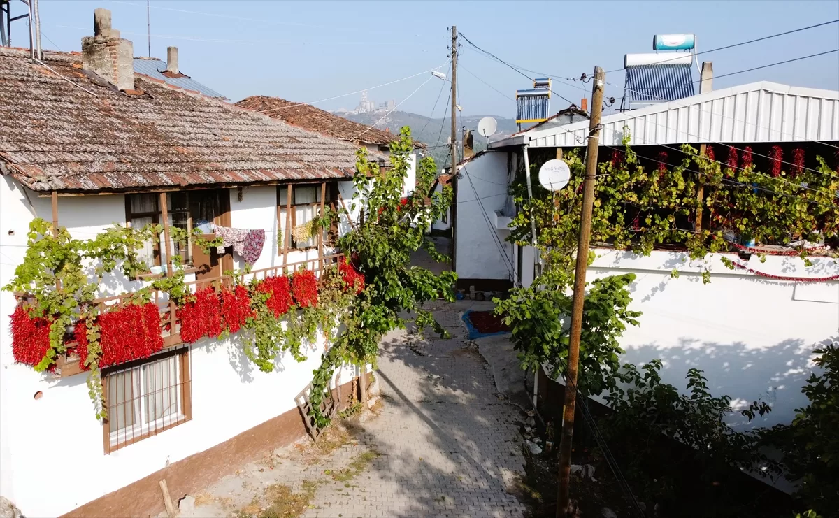 Hemen hemen her evin balkonuna, duvarına, çatısına asılarak kurutulan ve adeta köyü kırmızıya boyayan biberin oluşturduğu görüntü dikkati çekiyor.