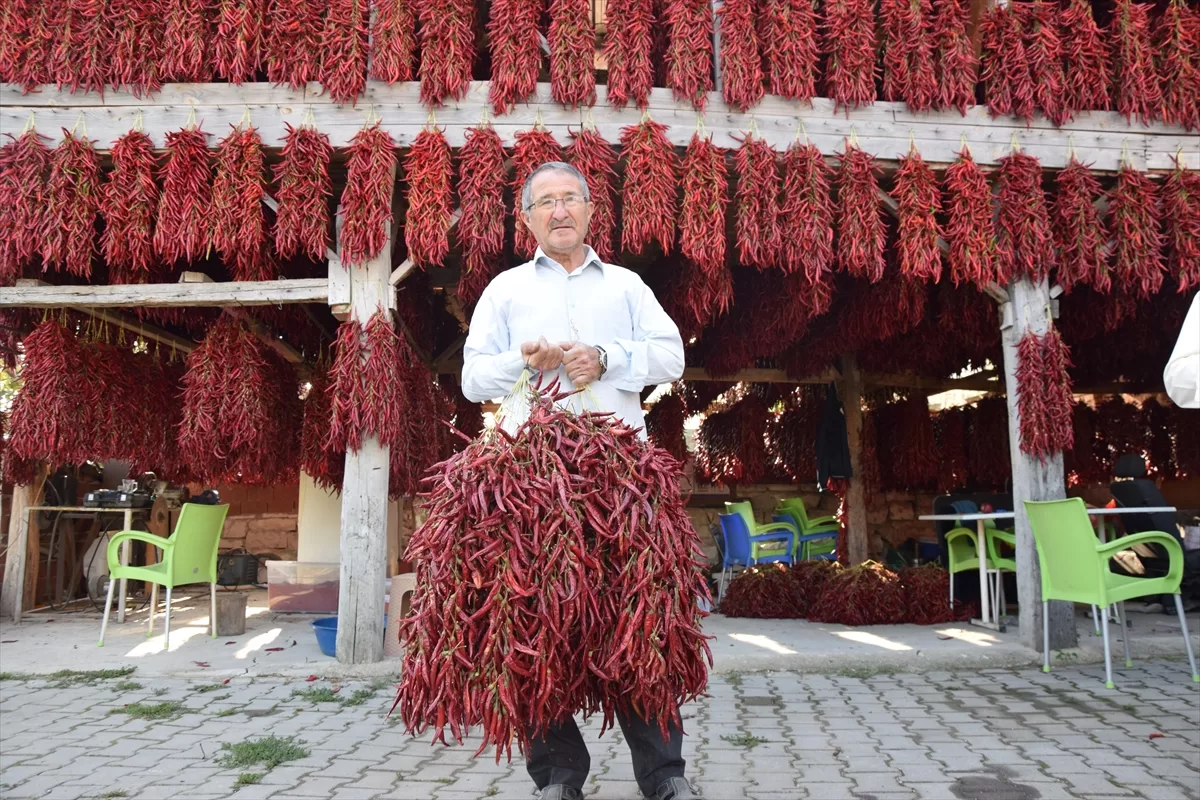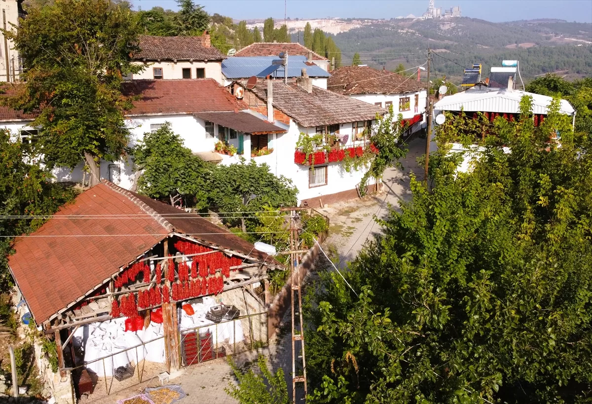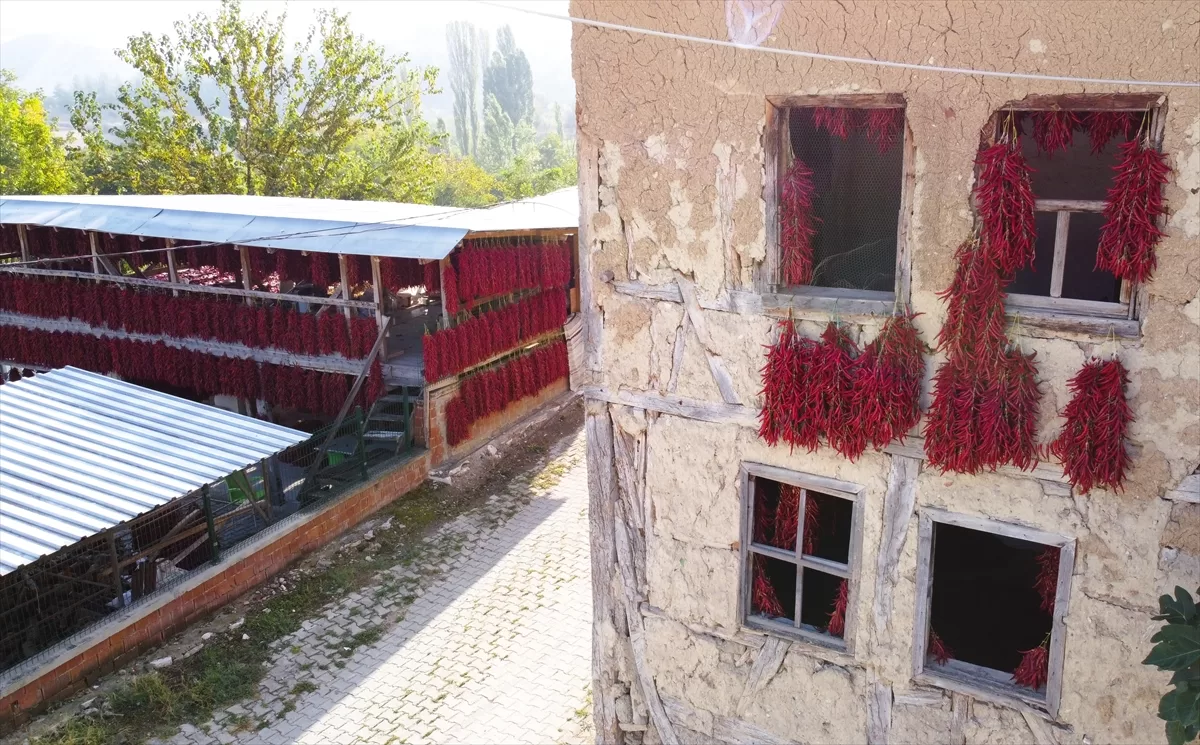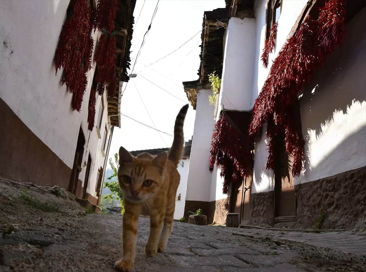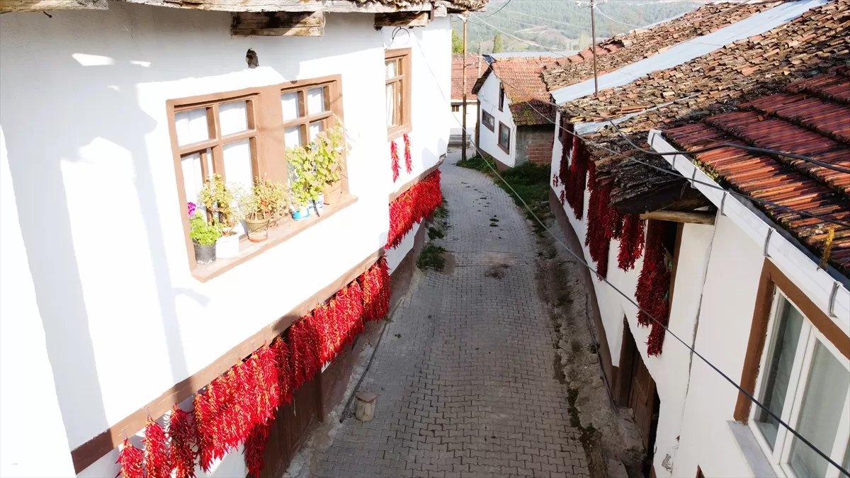 Hemen hemen her evin balkonuna, duvarına, çatısına asılarak kurutulan ve adeta köyü kırmızıya boyayan biberin oluşturduğu görüntü dikkati çekiyor.