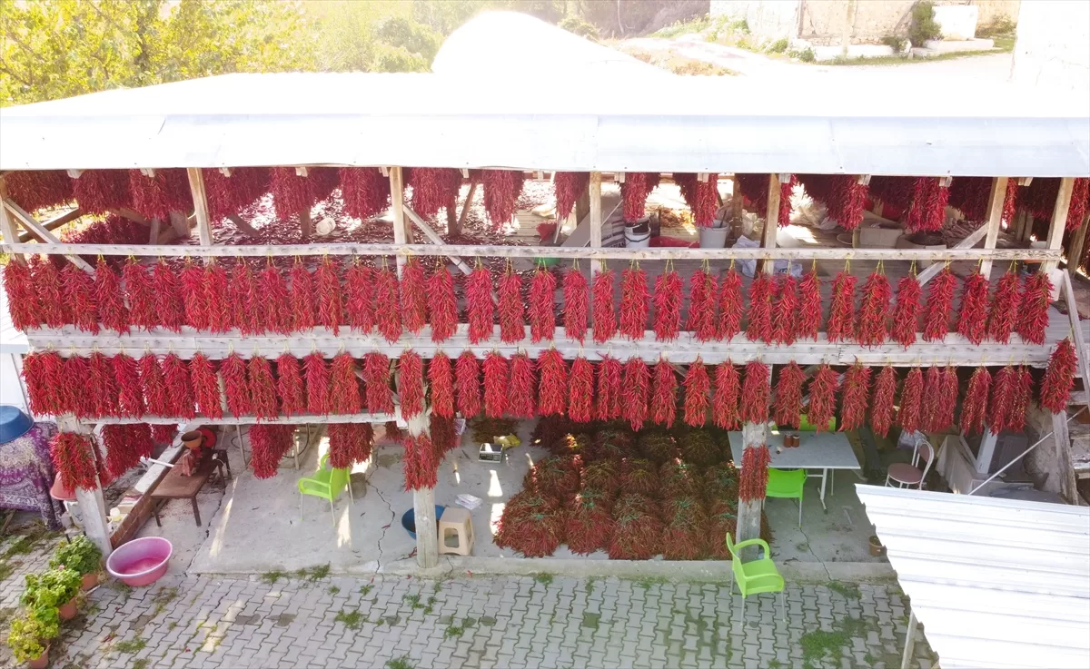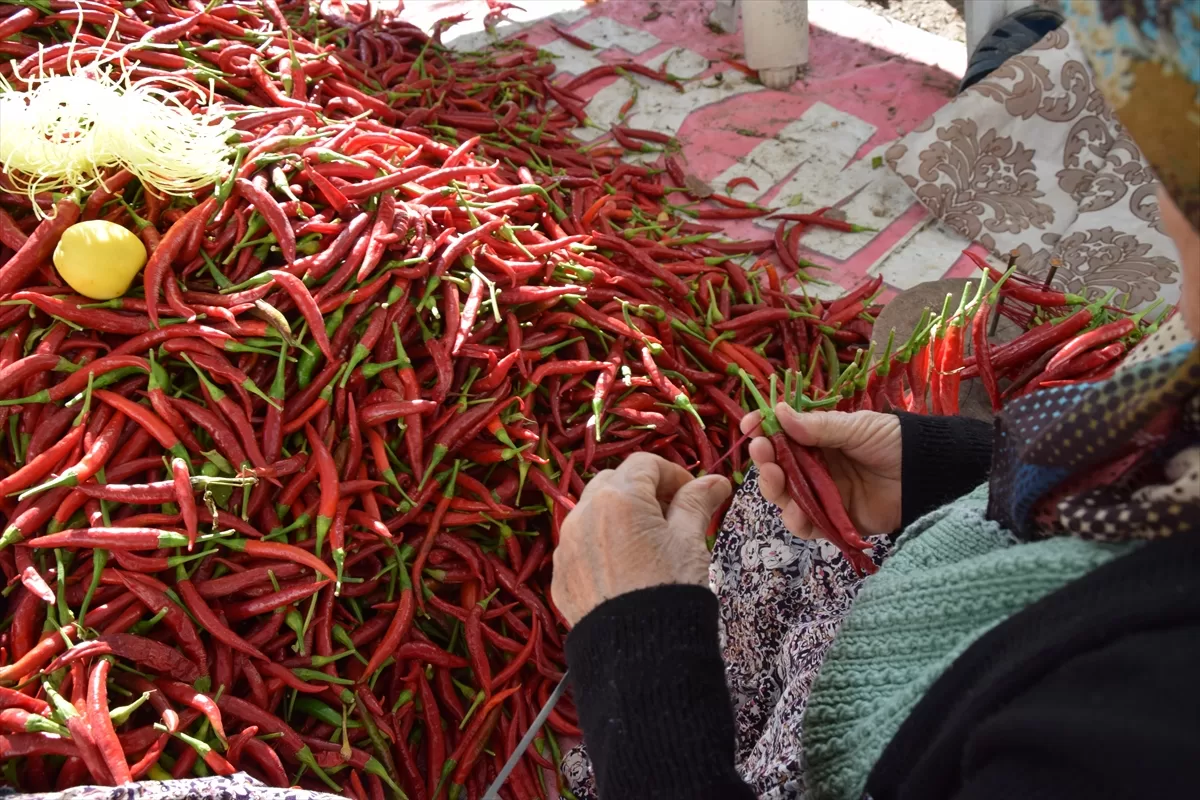 İl Tarım ve Orman Müdürlüğünün iyi tarım uygulamaları kapsamında yetiştirilen "Çukurören biberi", hasadın ardından kurutma işlemi için kadınlar tarafından özenle iplere diziliyor.