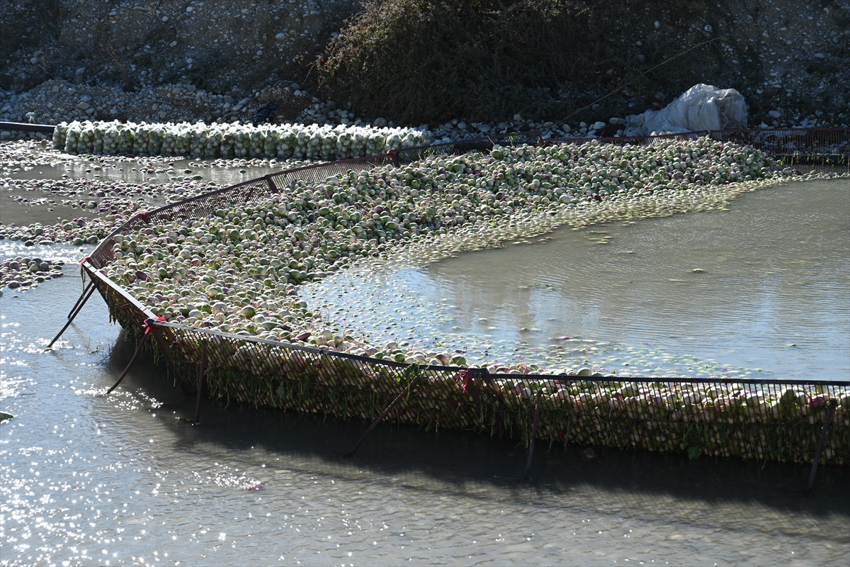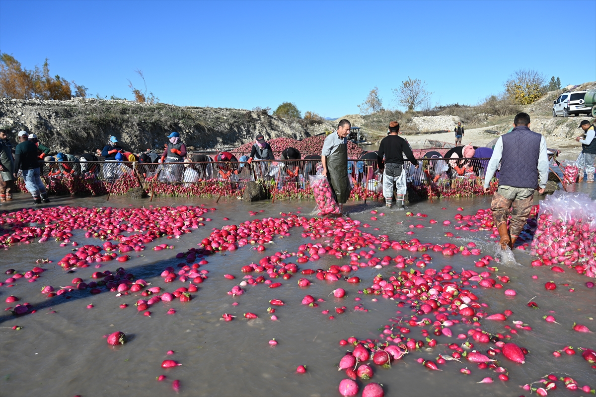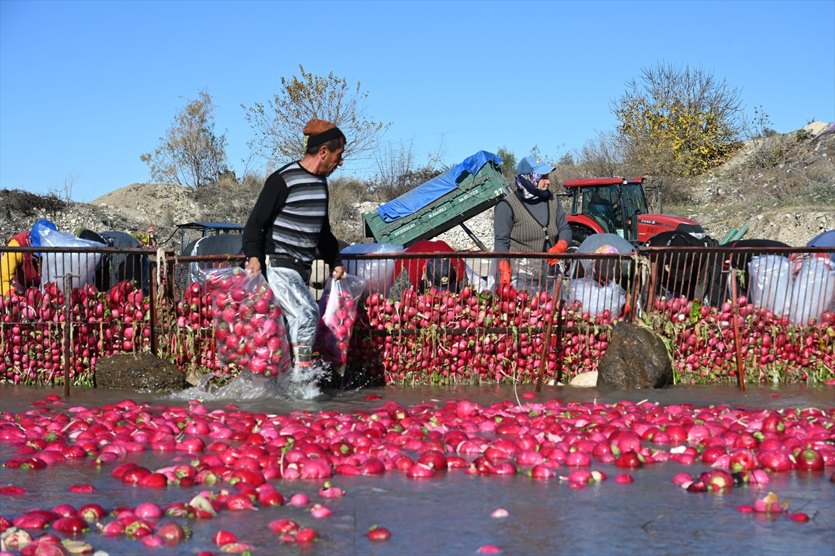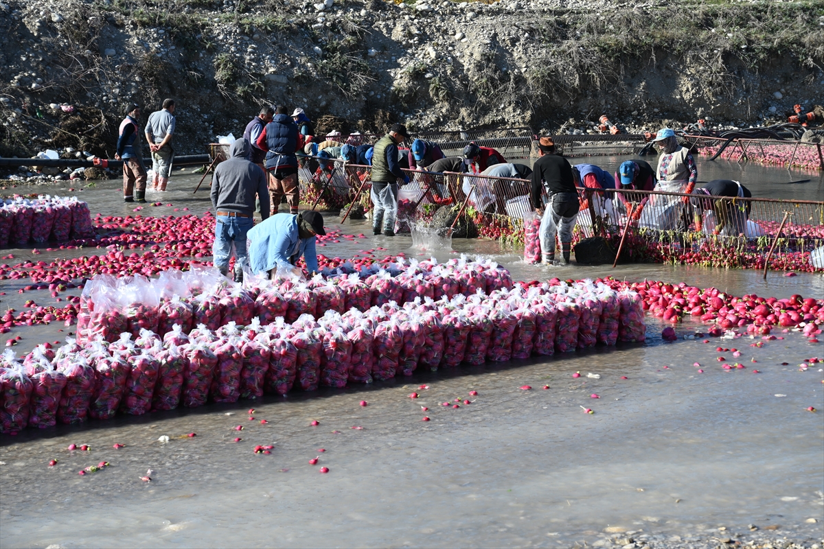 Tarım işçilerince tarlalardan toplanan turplar, Savrun Çayı'nda yıkanıp toprağından arındırılıyor.
