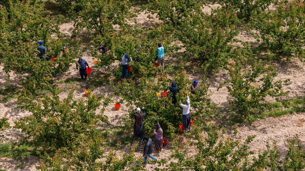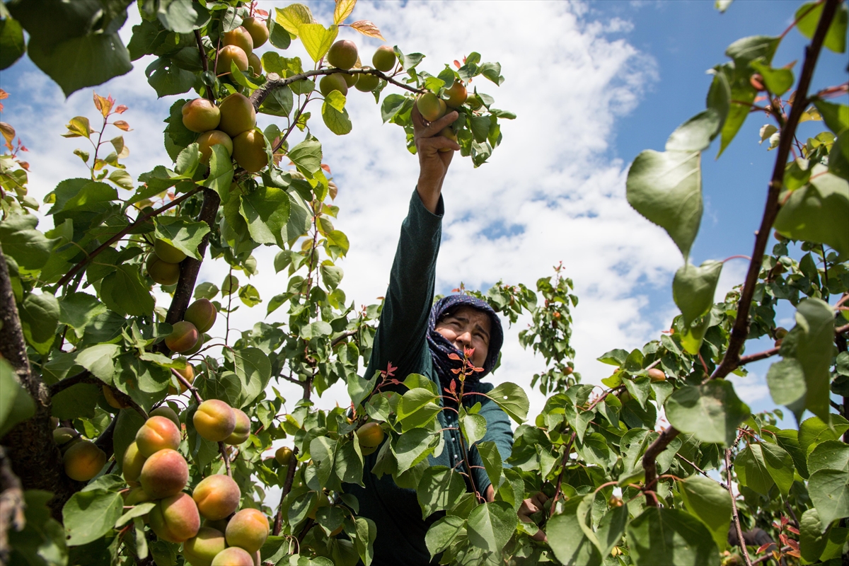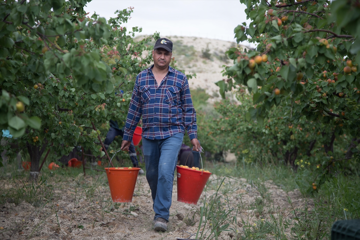 İşçiler, sabah erken saatlerde başladıkları mesailerinde olgunlaşan kayısıları özenle topluyor.