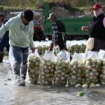 Soğuk suya giren çiftçiler ve tarım işçilerince temizlenen ürünler, zahmetli işlemin ardından paketlenip araçlara yükleniyor.