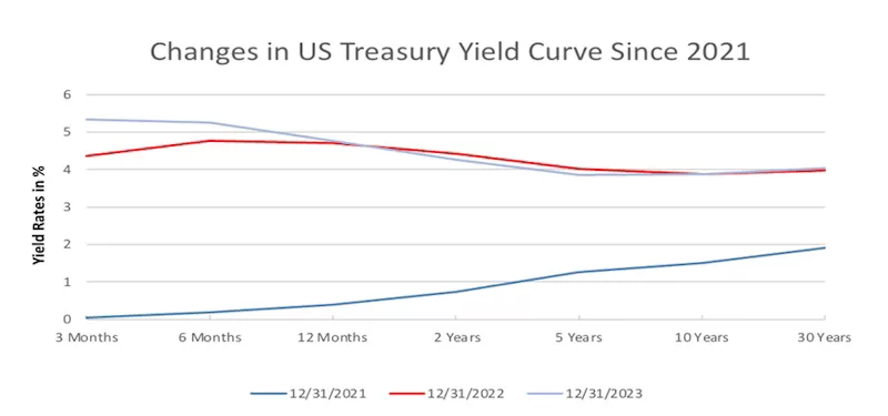 In this scenario the short end might go up as FED considers rate increase(s), and the rates in the long end such as US Treasury bonds with 10- and 30-year maturities would drop, in a way similar to what happened between end of 2022 (red line) to end of 2023 (gray) as illustrated in the graph below.