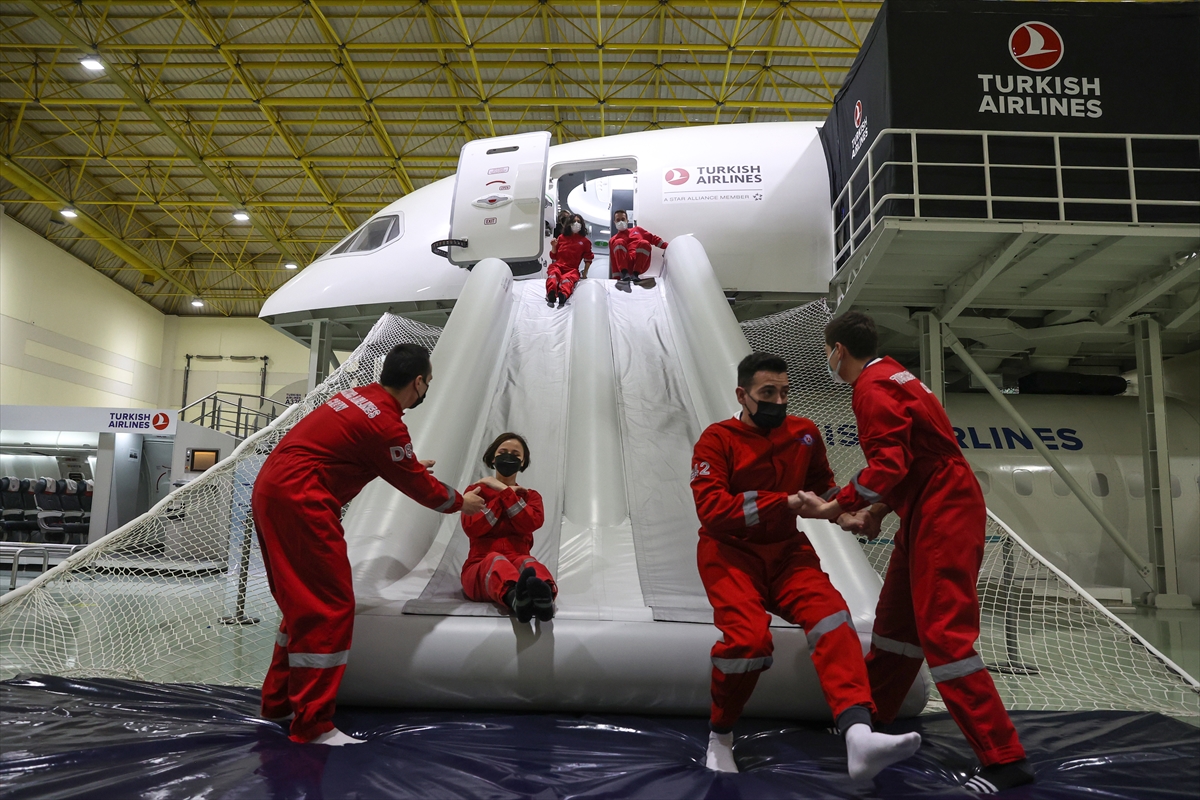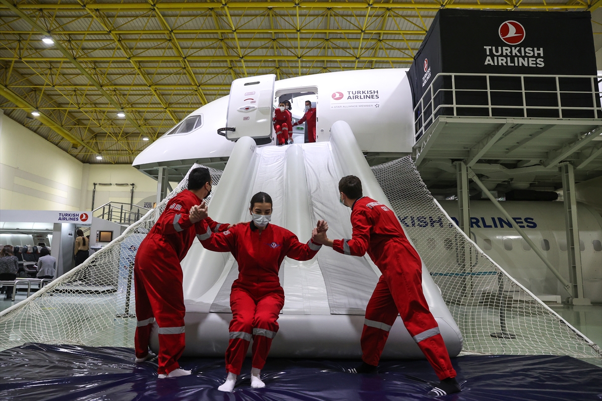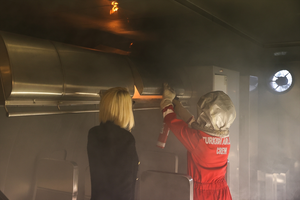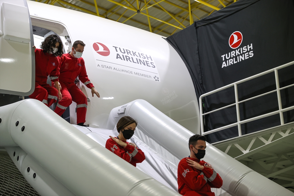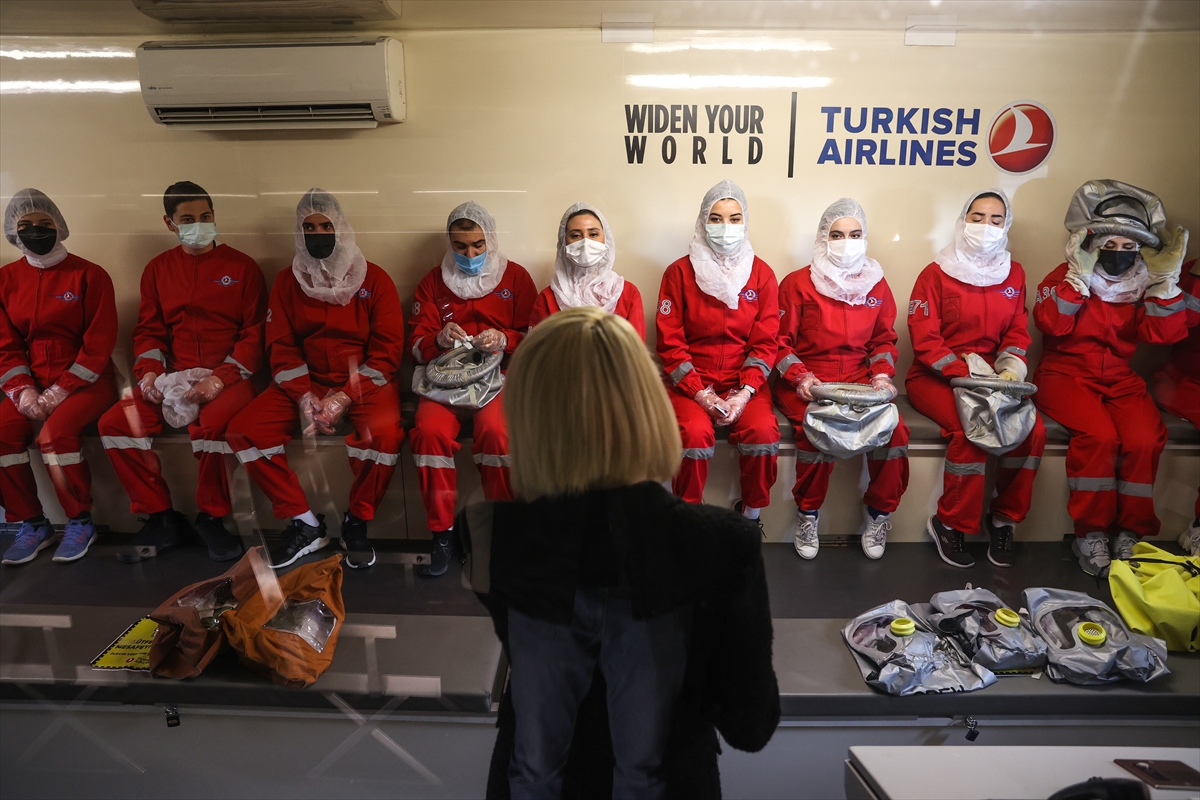 Açıklama sonrasında, THY'de iş başı yapacak kabin ekibinin acil durumda yolcu tahliyesi ve yangınla mücadele senaryosu uygulamalı eğitim olarak gerçekleştirildi.