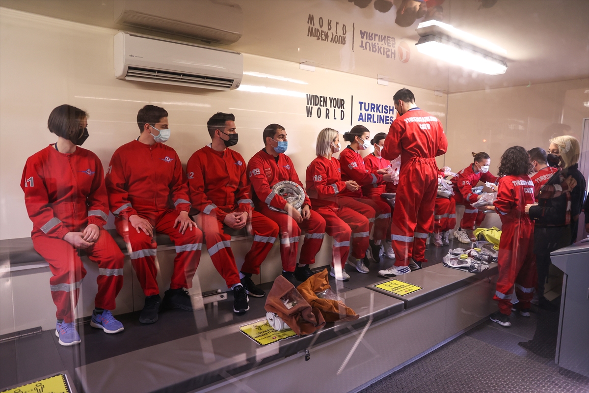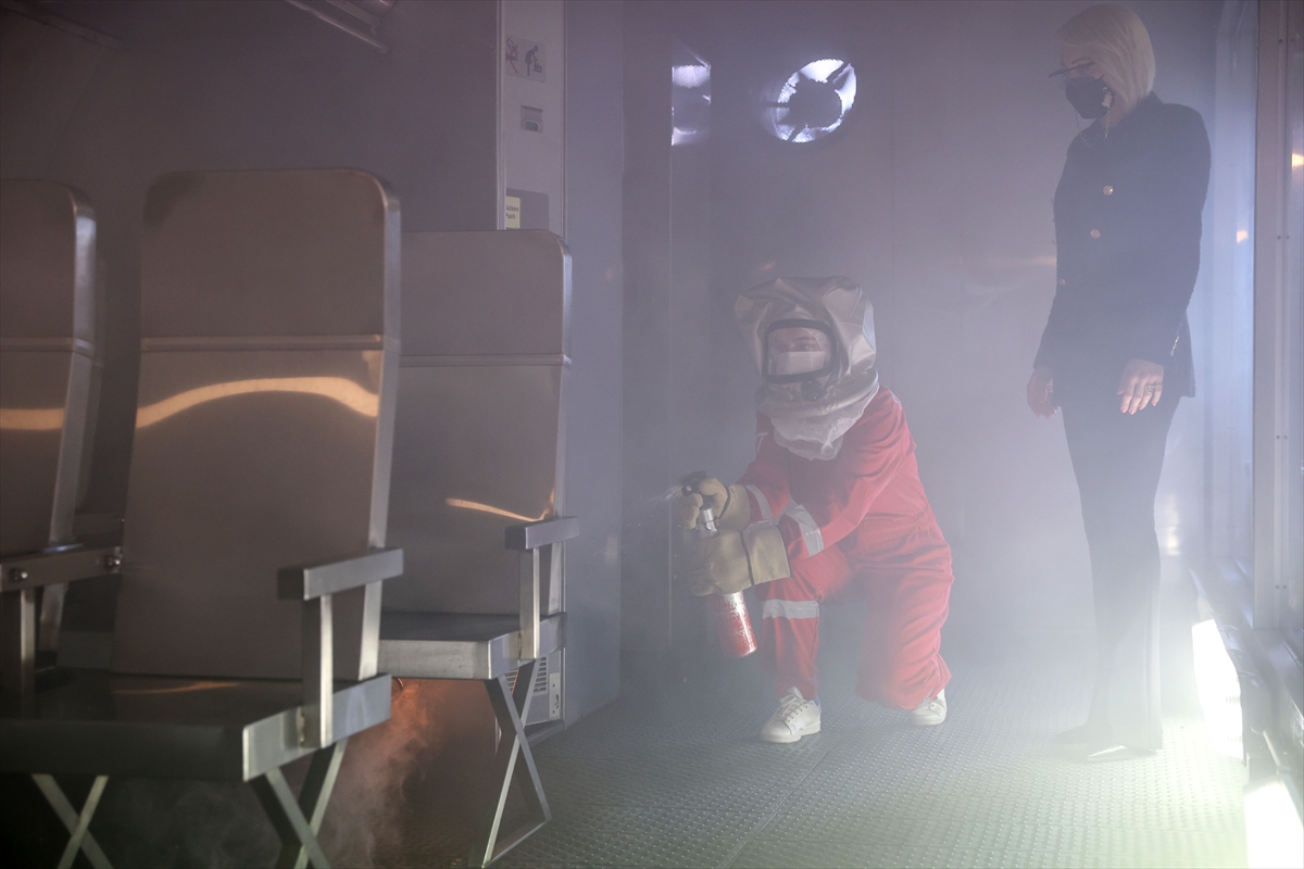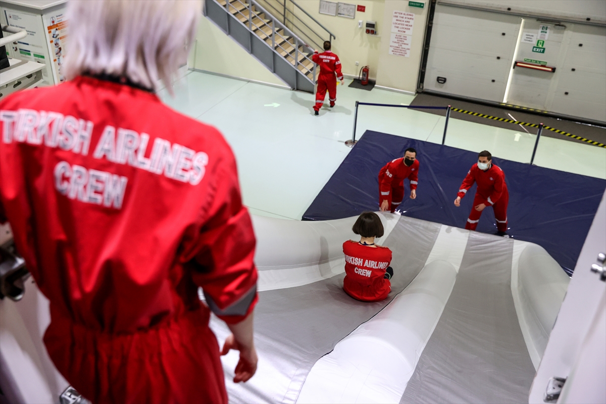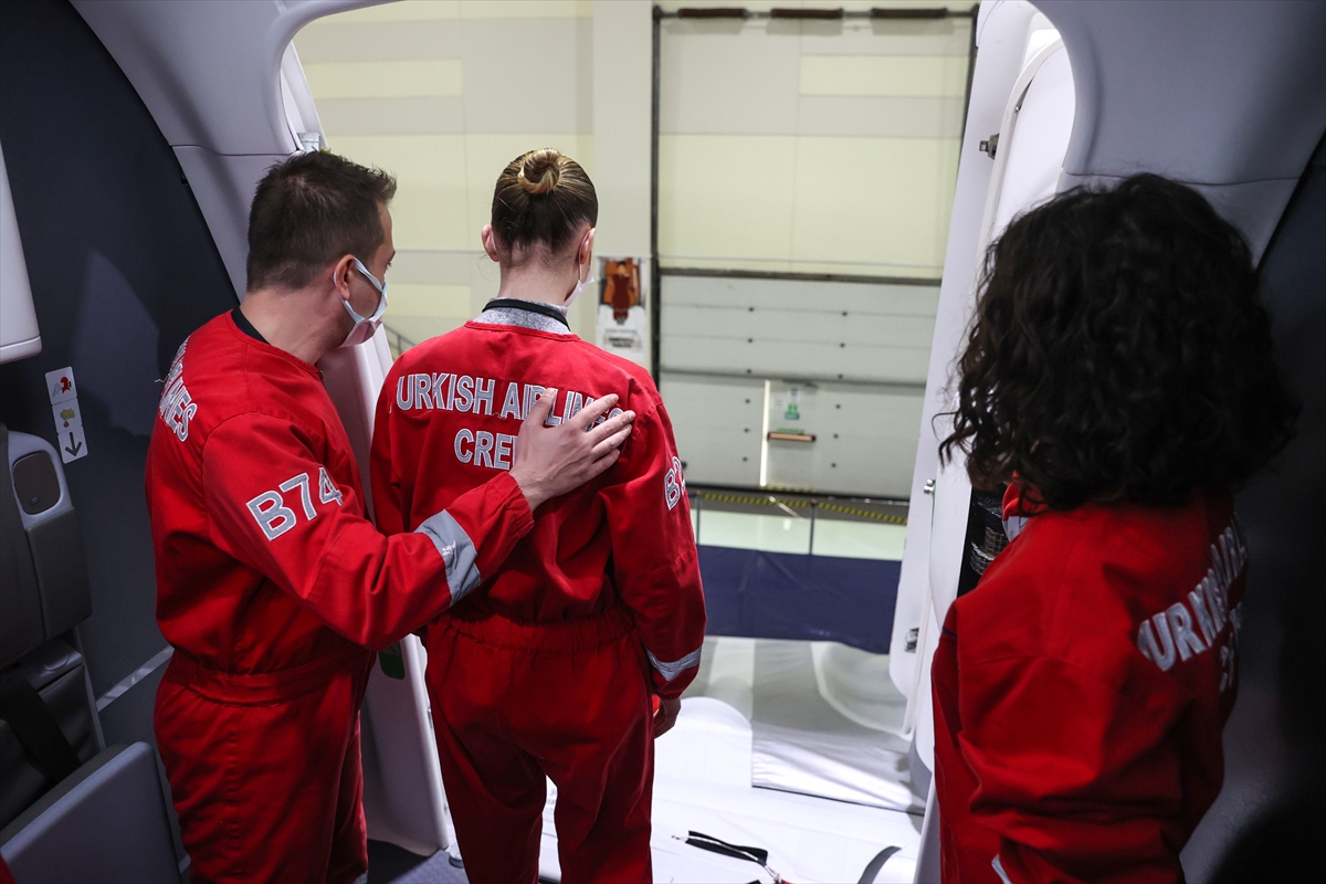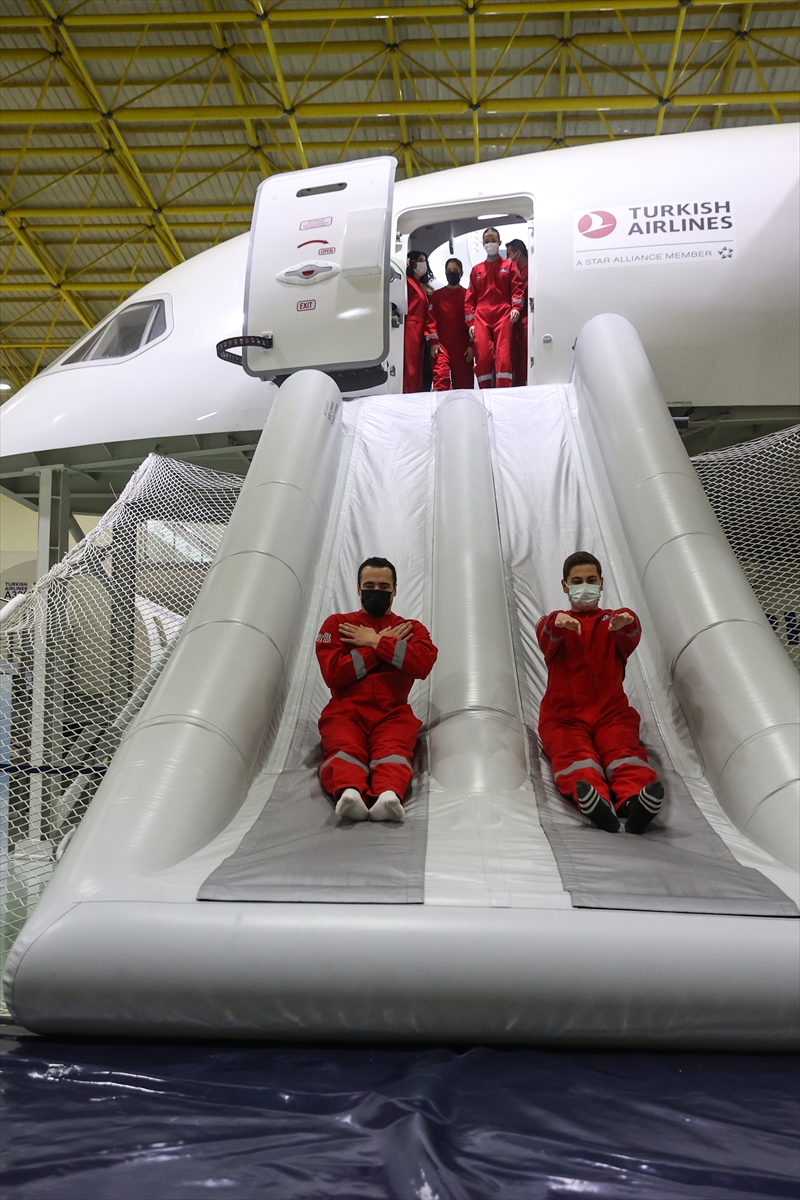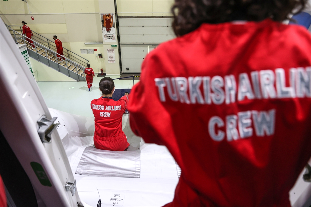Açıklama sonrasında, THY'de iş başı yapacak kabin ekibinin acil durumda yolcu tahliyesi ve yangınla mücadele senaryosu uygulamalı eğitim olarak gerçekleştirildi.