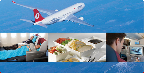 Türk ve dünya mutfaklarından zengin bir menü Okyanus ötesi, uluslararası ve iç hatlar seferlerinde yolculuğun süresine bağlı olarak kahvaltıdan akşam yemeğine kadar Türk ve Dünya mutfaklarından oluşturulan menülerde servisler yapılıyor. Menüde içki, taze meyve suyu, sıcak ve soğuk içeklerde yer alıyor. Uçuşlardaki ana yemeklerde şiş kebap, karnıyarık, mantı, imam bayıldı gibi Türk mutfağının spesiyalitelerine yer veriliyor. Kalkış saatine göre sıcak kahvaltı, soğuk veya sıcak yemek servisleri yapılıyor. Alkollü ve alkolsüz içki seçenekleri geniş bir yelpazede sunuluyor. Uçuş süresine göre çorba ve meyve servisleri de var.