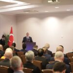 “AB, bizim yüzde 41 ihracat yaptığımız en önemli ticaret ortağımız. OECD ülkeleri, Kuzey Amerika’yı eklediğimizde ticaretimizin yüzde 60 civarında yaptığımız bir bölge. Yatırımlarımızda da doğrudan yatırımlar da 265 milyar dolar Türkiye’ye doğrudan yatırım geldi. Bunun da yüzde 65’i bu bölgeden geliyor, Batı Avrupa ve Kuzey Amerika bölgesinden. Bizim için tabii önemli ortaklarımız. Asla göz ardı etmememiz gereken ortaklarımız. Ticaret olarak da Avrupa Birliği’nin üçüncü ülkeler anlamında beşinci ortağı Türkiye. Yani AB için de Türkiye asla küçümsenmeyecek bir ortak konumunda. O yüzden sizler işlerinizi yaparken başınız dik, arkanızda güçlü Türkiye’nin, güçlü Türk ekonomisinin desteğiyle daha rahat çalışabilirsiniz.”