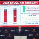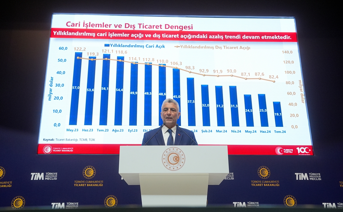 “2024’ün eylülünde yıllıklandırılmış ihracatımız yüzde 3,4 artış ile 261,6 milyar dolara ulaşmıştır. Mal ihracatında son 1 yılda 8,6 milyar dolar net artış sağlandı. İthalat düşüşündeki ana eğilim, bu yıl da devam etti. Yıllıklandırılmış ithalatımız geçen yıl 367 milyar dolar iken bu yıl 340,3 milyar dolara geriledi.”