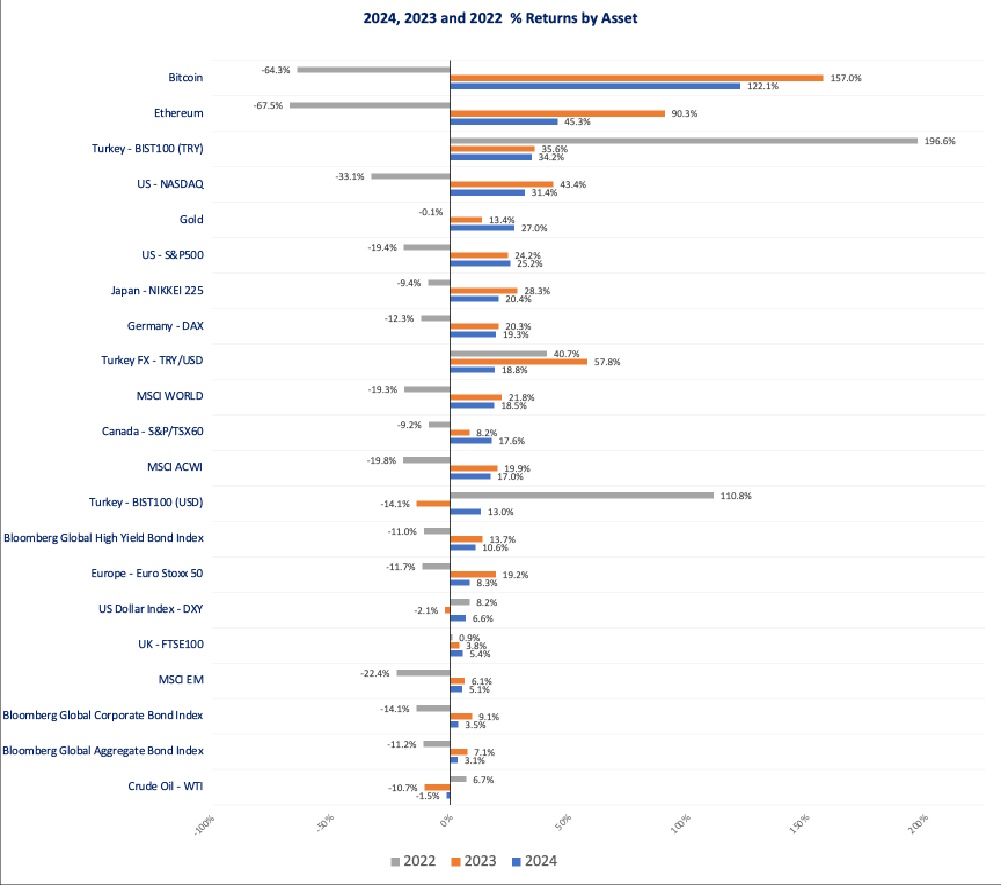 Amongst key commodities, one of the biggest winners was gold. As our readers may remember we had been underlining gold since 2022 given the geopolitical risks and economic uncertainties. Therefore, it is not surprising to see gold close the year with a +27% return. Gold’s return was mostly boosted towards the end of the year by the US Presidential election although softened up from its peak once the results were called in as discussed in more detail in our previous issue.