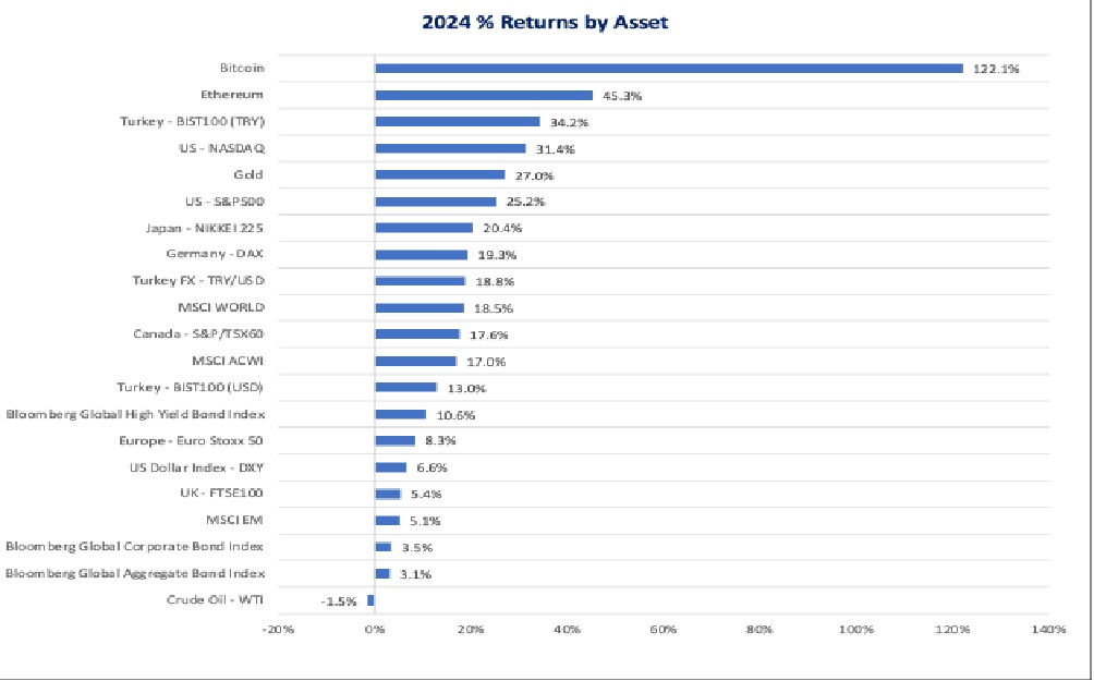 – Outside the traditional asset classes, Bitcoin had an eye-popping year with an unprecedented and unexpected volatility that carried the crypto currency to +122% annual return as of December 27, 2024. Trump getting in power also supported the crypto world given Trump’s pro-crypto stance. Ethereum, while benefitting from the broader investor base, returned only +45.25% underperforming Bitcoin.