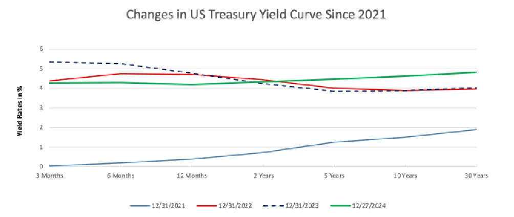 More importantly though, the US yield curve which had been inverted since the end of 2021 (blue line in the graph below), finally reverted back to its normal upward sloping shape by end of 2024 (green line). This means the rate markets, at least in the US are now returning to their normal conditions. That is thanks to FED cutting rates and the market dynamics unwinding the expectation of a slow down or recession in the long run. This floated the higher end of the yield curve while dropping the short end of the curve due to lower FED rates. Whether the yield curve will remain as such in 2025 remains to be seen.